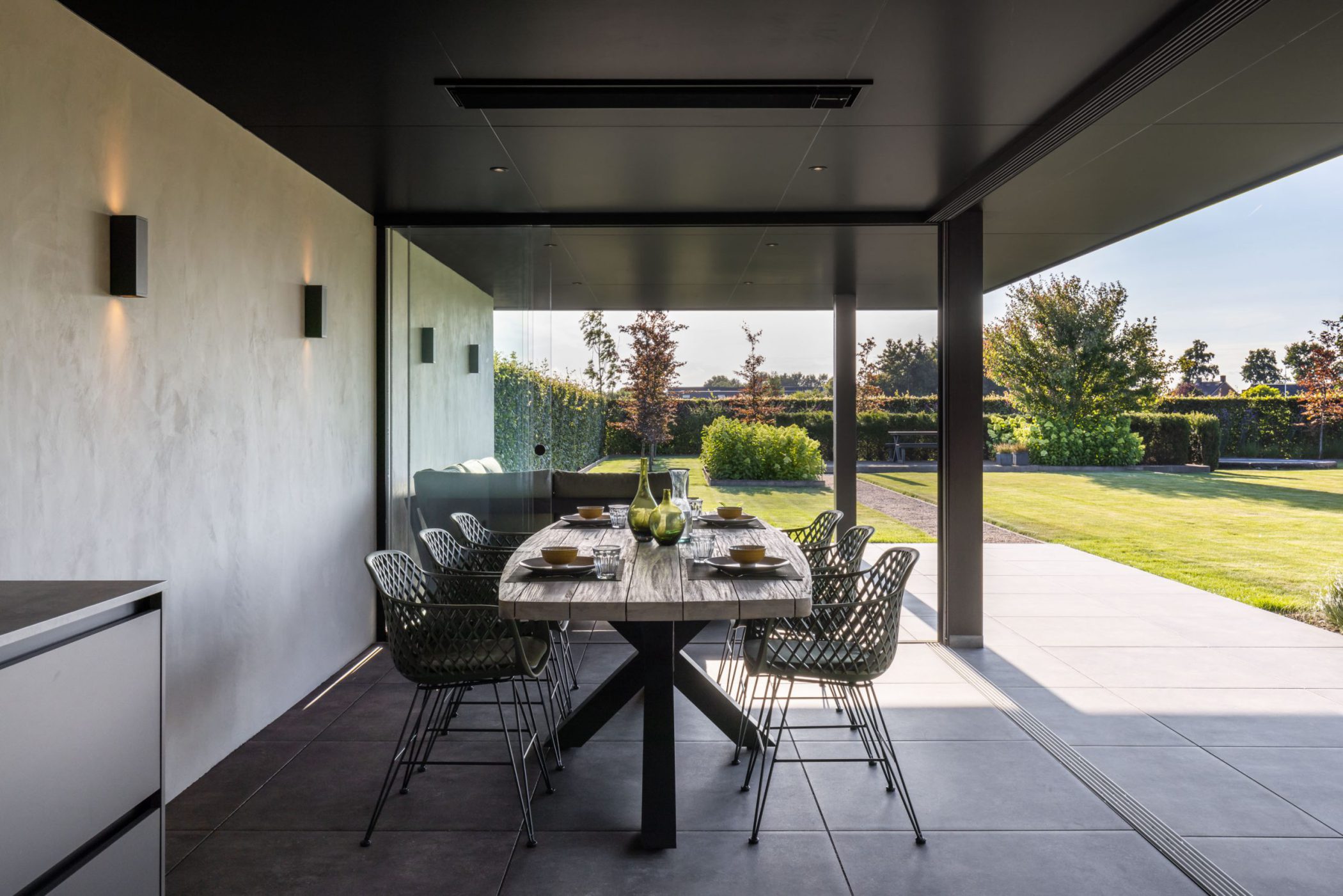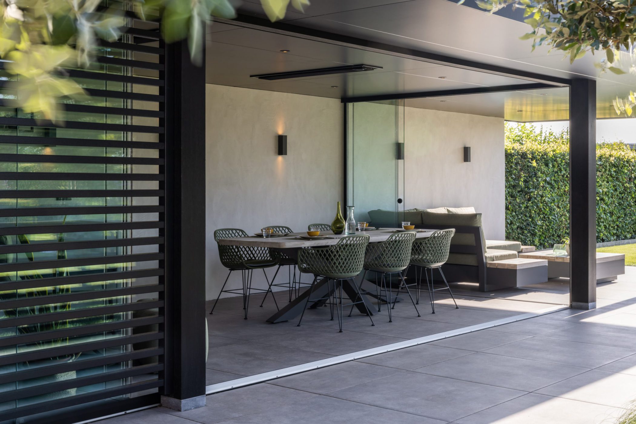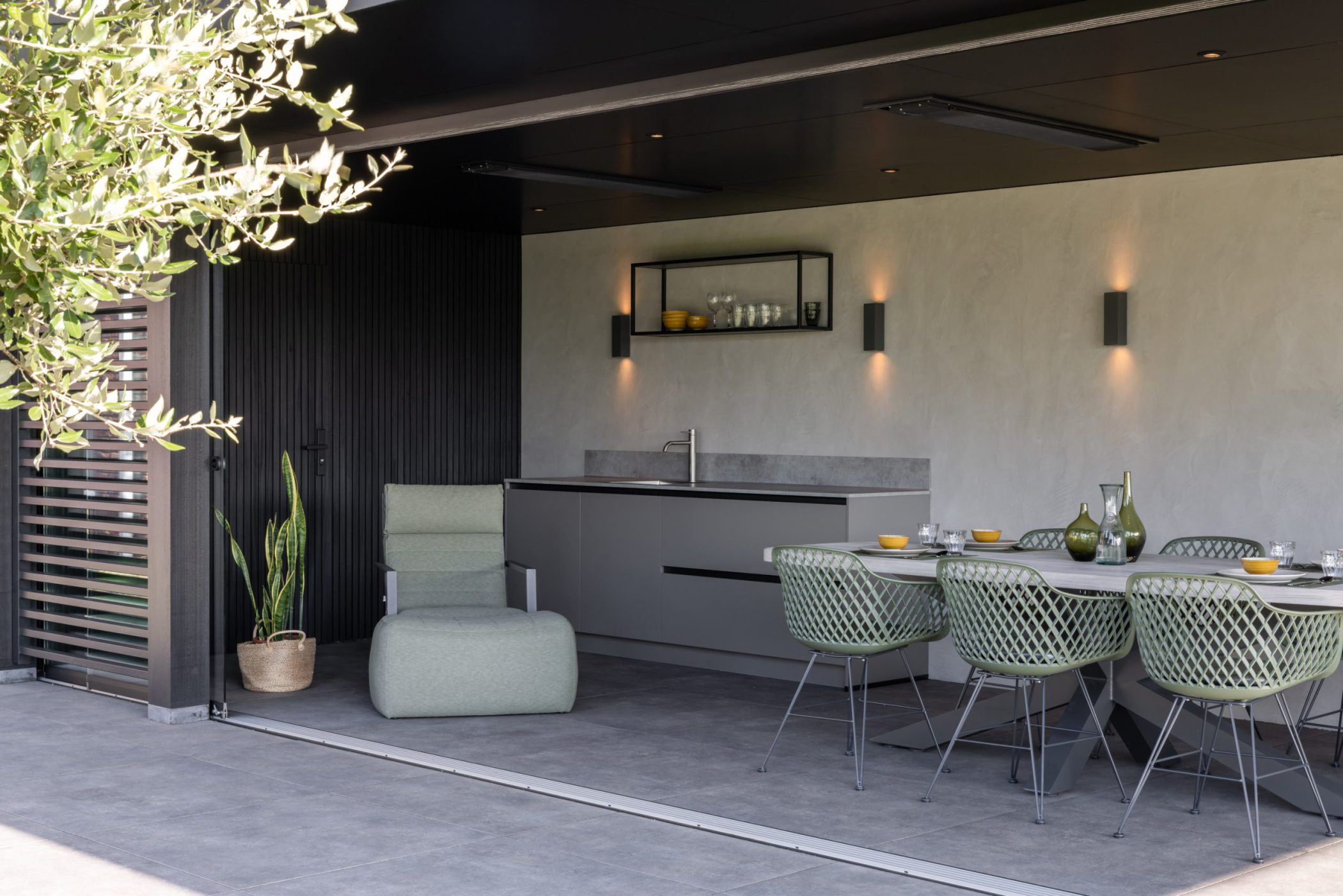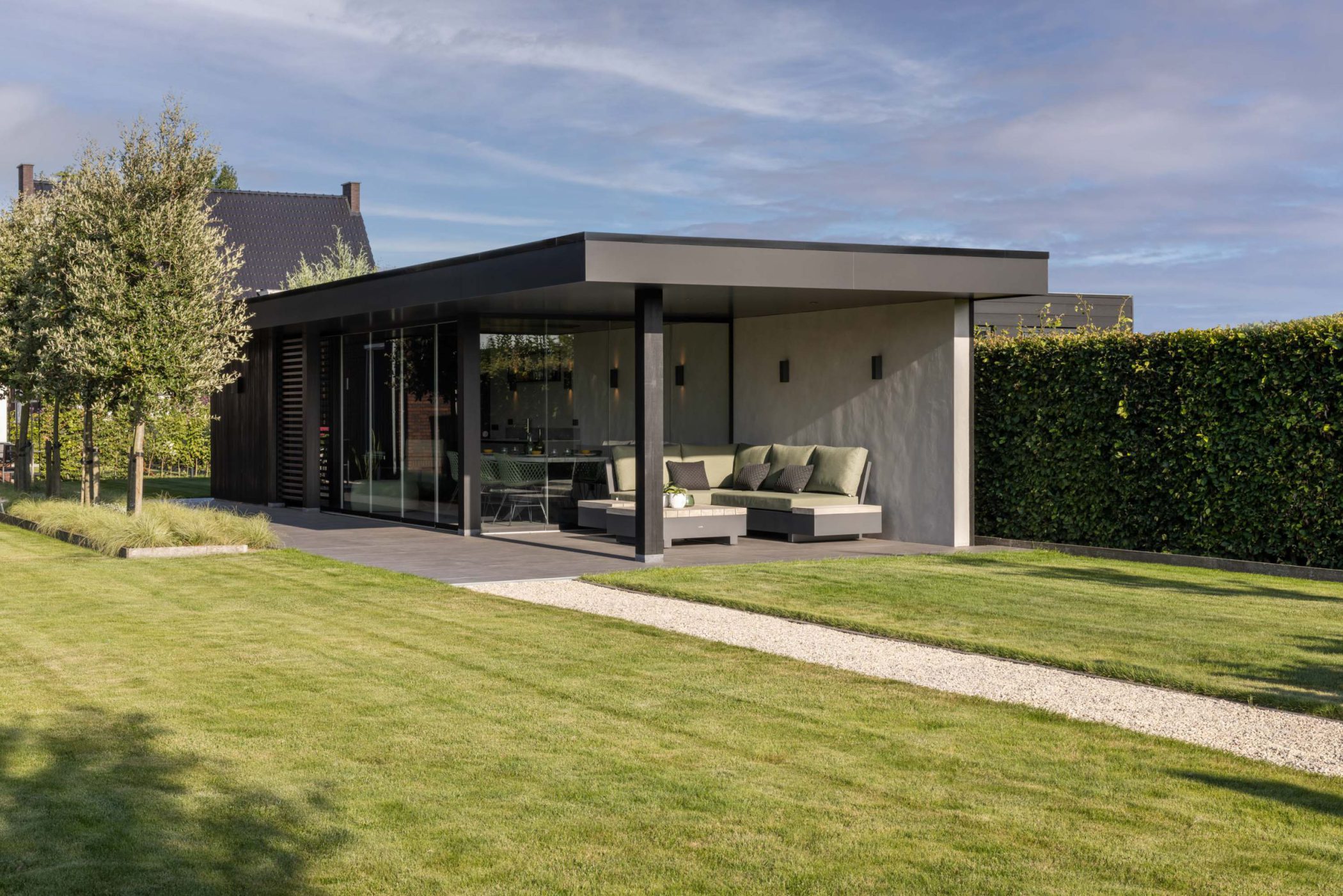 Een plek om tot rust te komen, samen te zijn en te genieten van het buitenleven, het hele jaar door. Deze moderne tuinkamer is helemaal op maat gemaakt, met liefde voor hout, oog voor detail en gevoel voor sfeer. Ook op koudere dagen is dit de ideale plek in de tuin. Dankzij de strakke inbouwheaters en de glaswanden blijft het aangenaam warm, terwijl het uitzicht en de lichtinval behouden blijven. Met een berging, een volledig keukenblok en een eigen toilet is deze tuinkamer van alle gemakken voorzien.