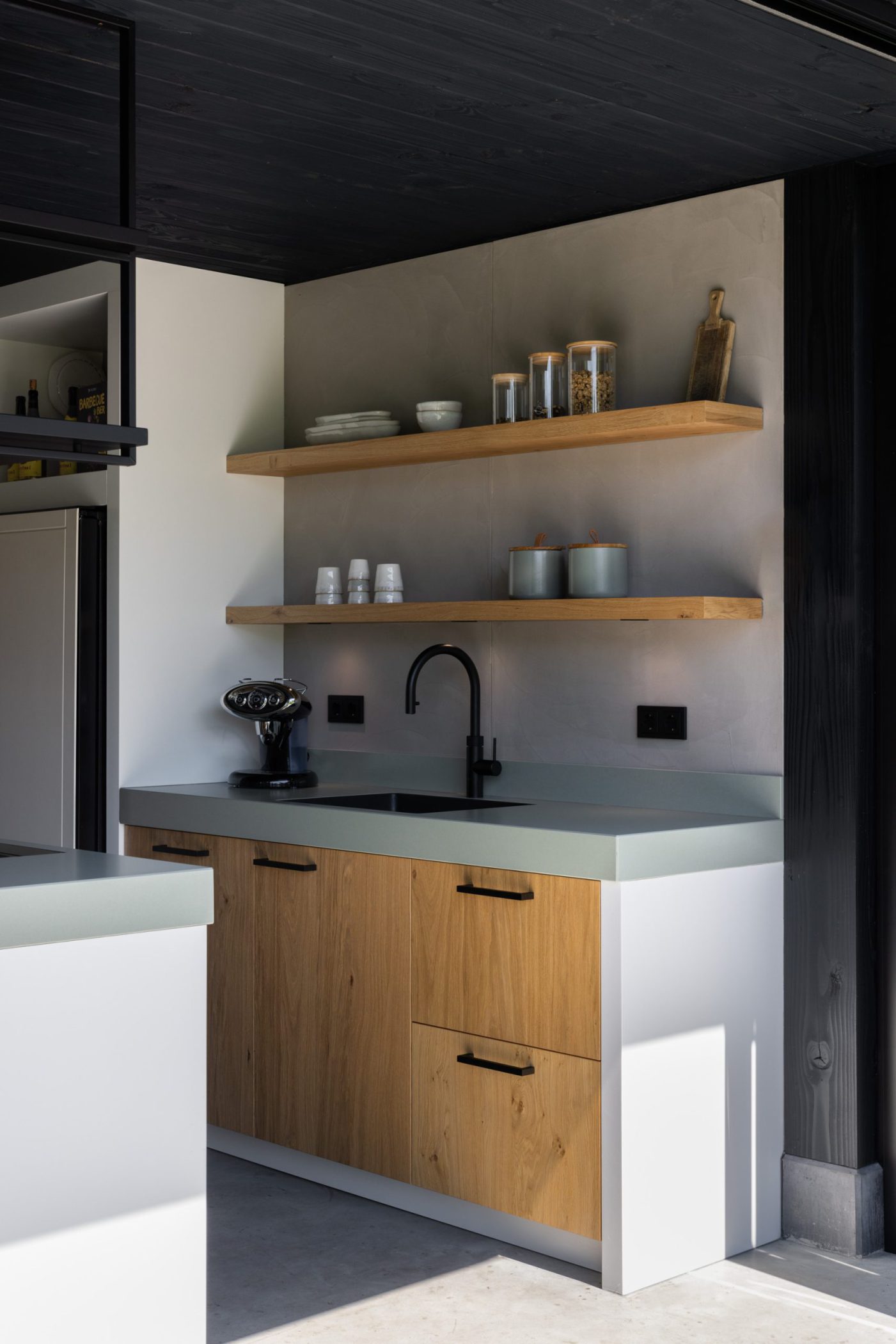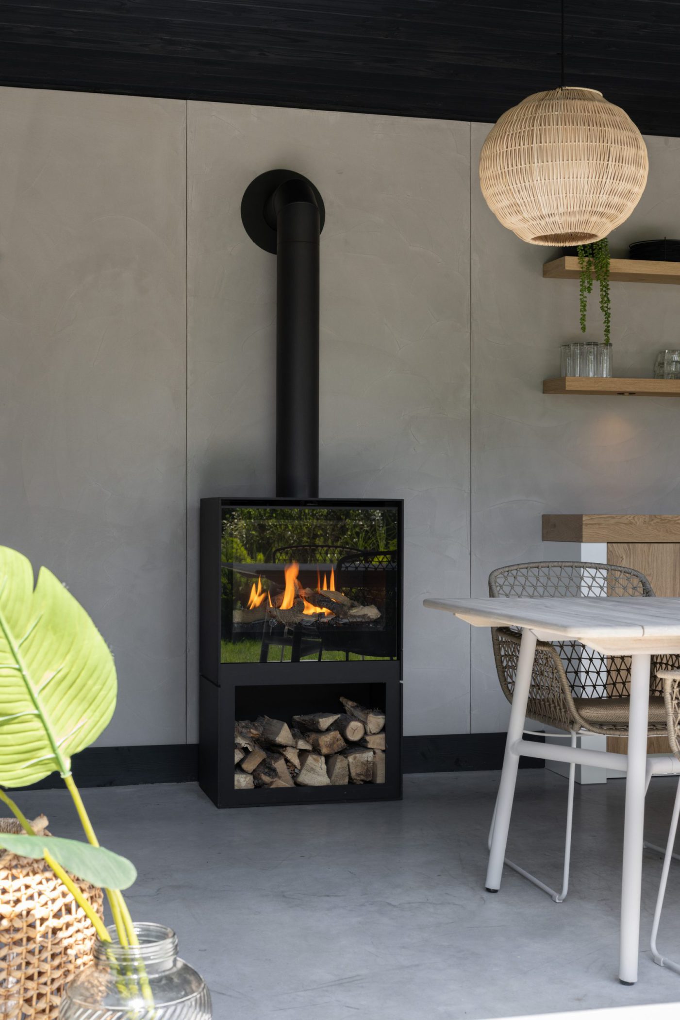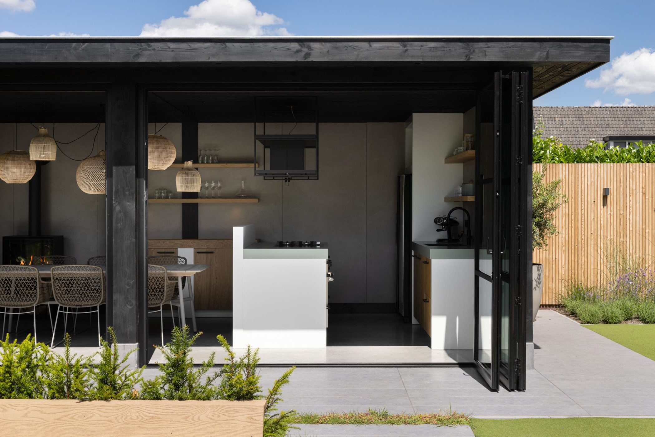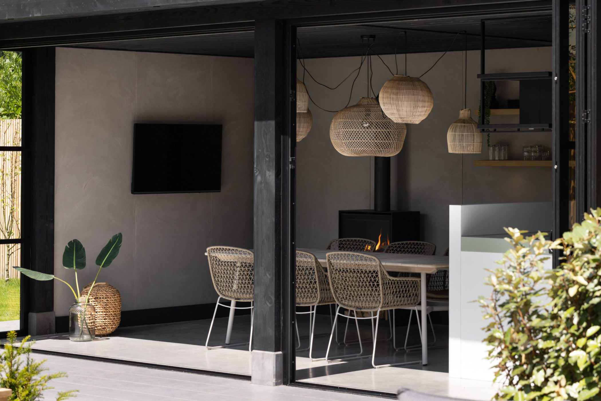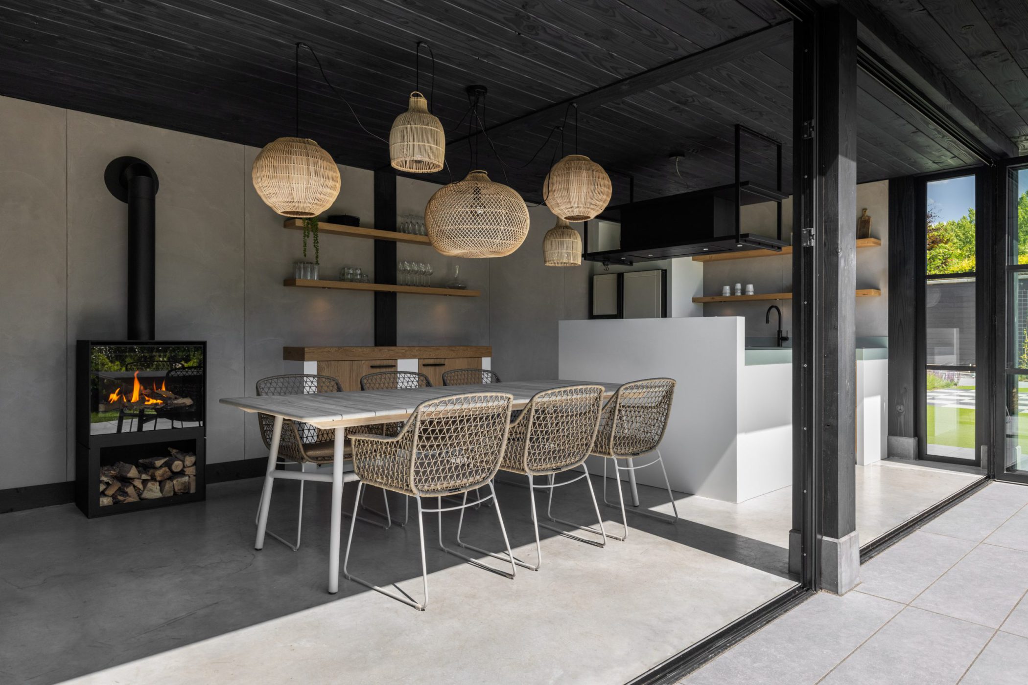 Slim ontworpen en uitgevoerd met hoogwaardige materialen biedt deze plek het comfort van binnen, met de vrijheid van buiten, het hele jaar door. De buitenkeuken vormt het warme hart van de ruimte, versterkt door een sfeervolle kachel die zowel warmte als karakter toevoegt. Van een rustig ontbijt in de zon tot een gezellige avond bij het vuur: hier wordt buitenleven écht beleefd.