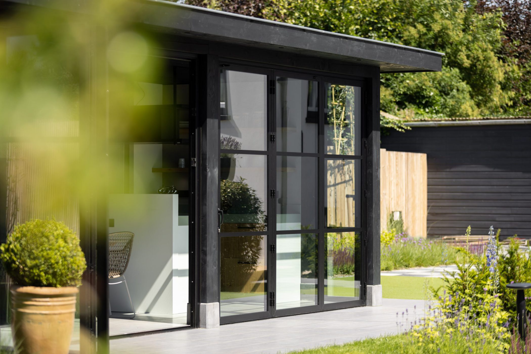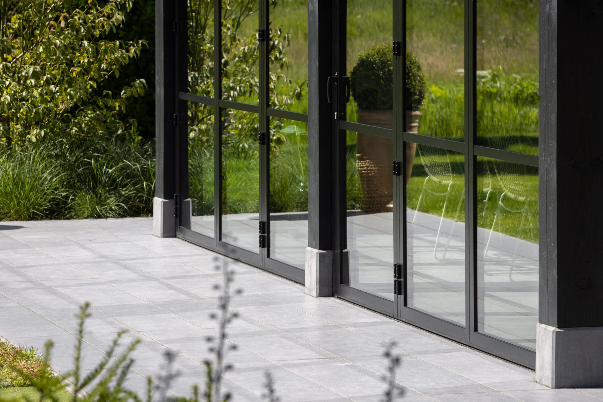 Deze tuinkamer is gebouwd op een solide betonvloer, met wanden afgewerkt in basebeton, een stijlvolle keuze met een industriële, moderne uitstraling. De constructie is vervaardigd uit Douglas hout: sterk, duurzaam en natuurlijk mooi. Samen vormen deze materialen een krachtig geheel dat jaren meegaat én indruk maakt.