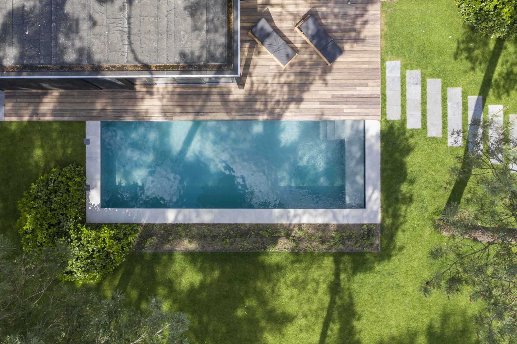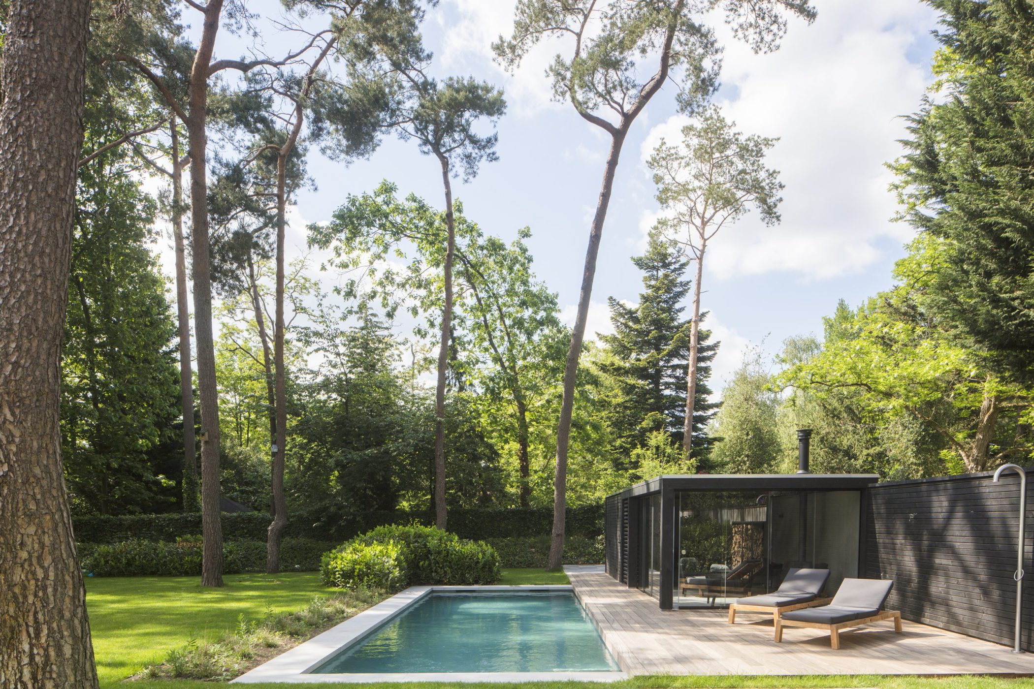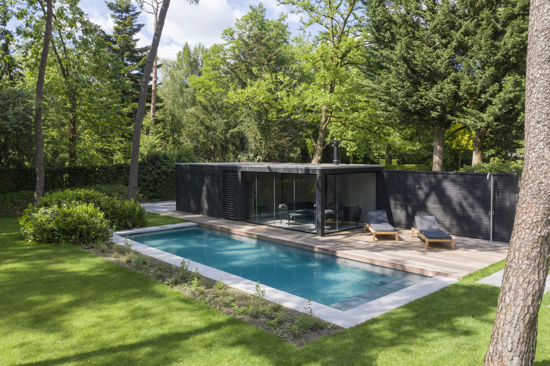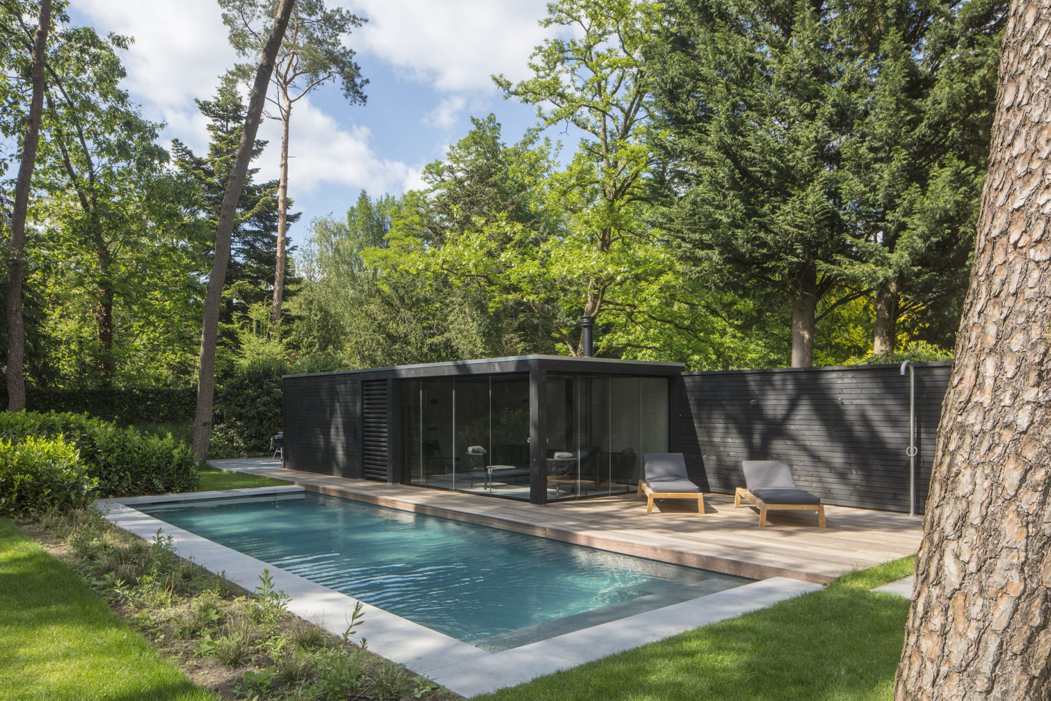 Een luxe poolhouse, op maat ontworpen. Omgeven door een strakke houten vlonder. Een design dat indruk maakt! Het poolhouse heeft een lounge, berging met zwembadtechniek, kleedruimte en een extra overdekte berging aan de achterzijde. In het poolhouse ligt een strakke betonvloer. Het plafond is behandeld met walnootolie en de wanden zijn diep donkergroen geschilderd. 's Zomers én in de winter een heerlijke plek in de tuin!