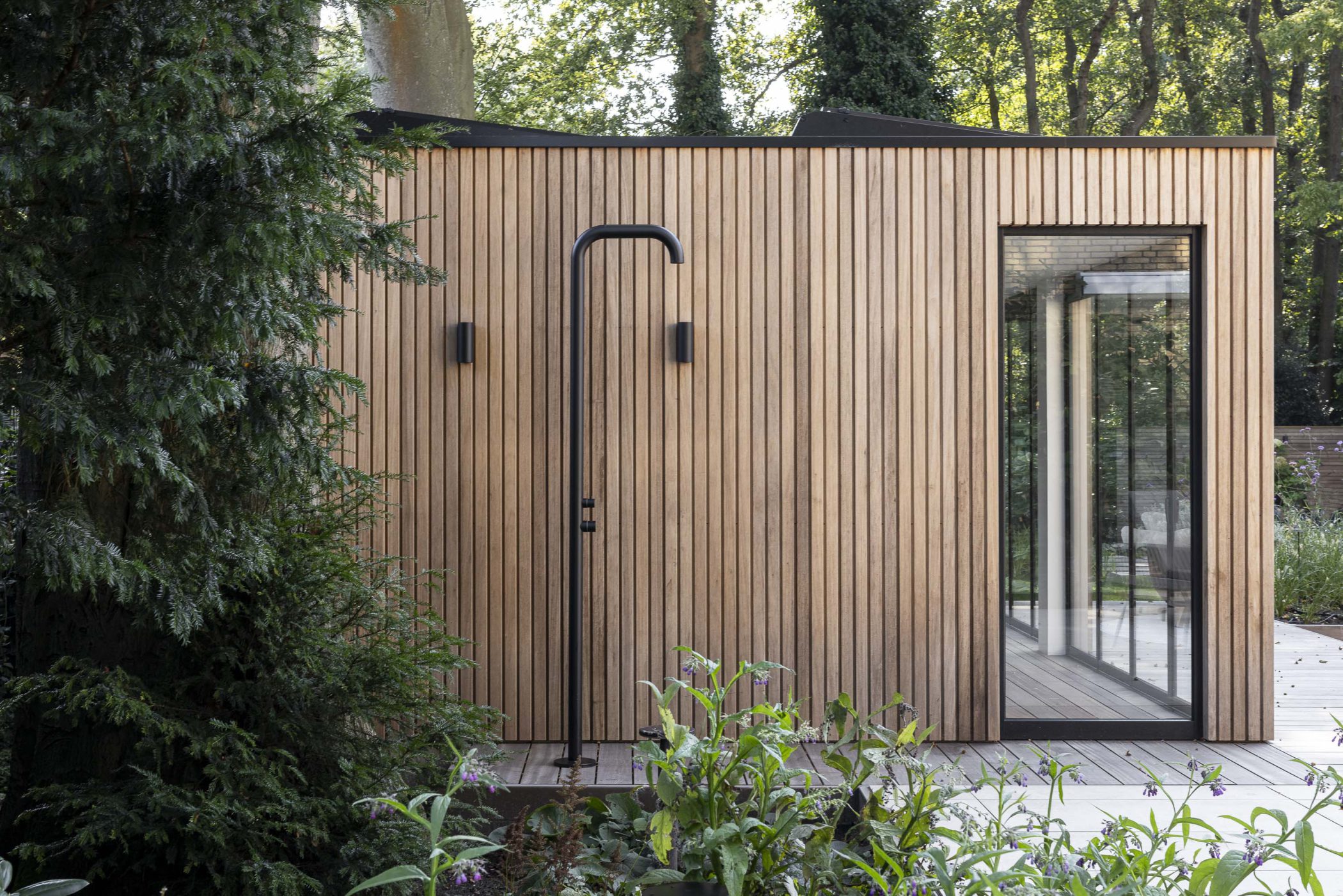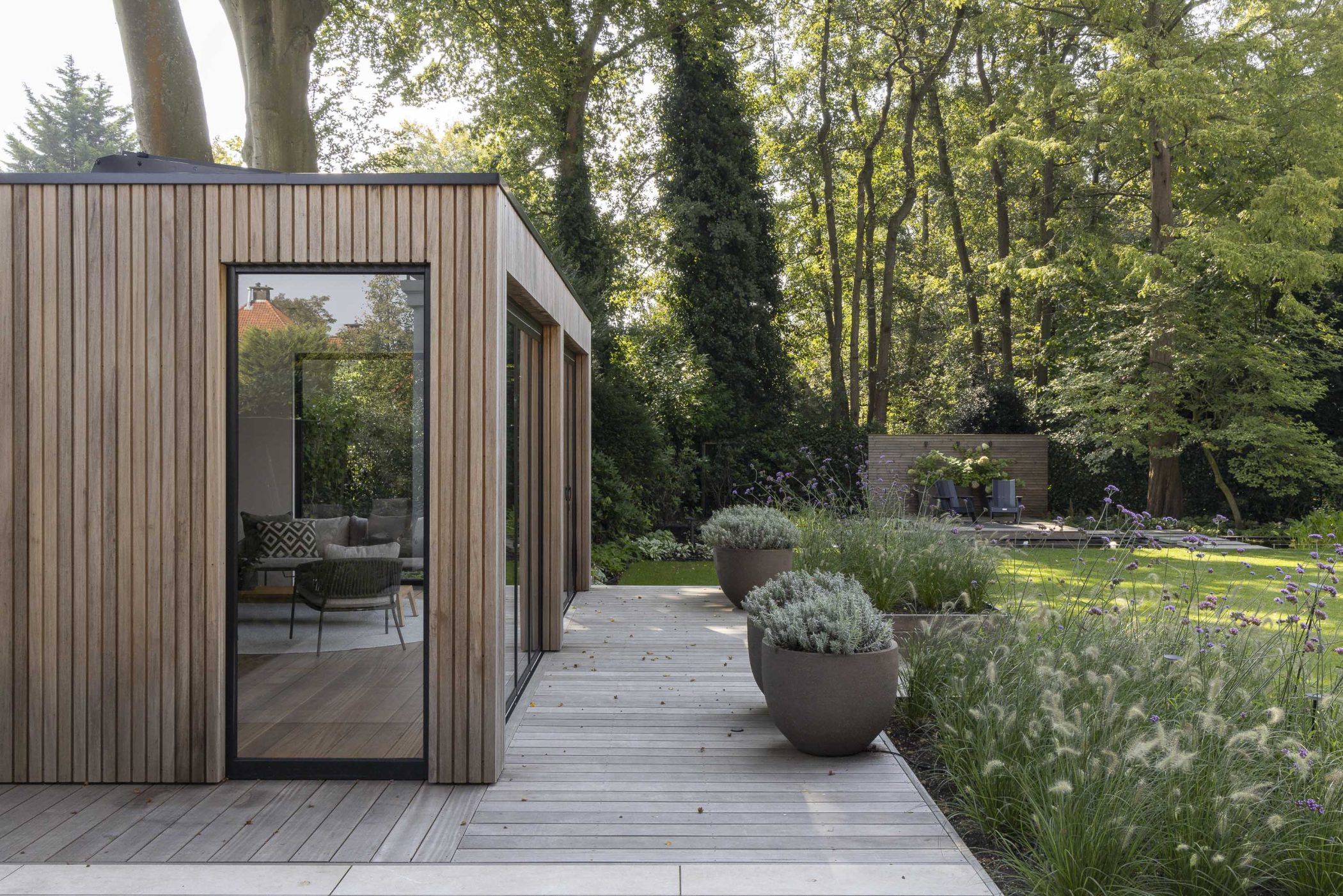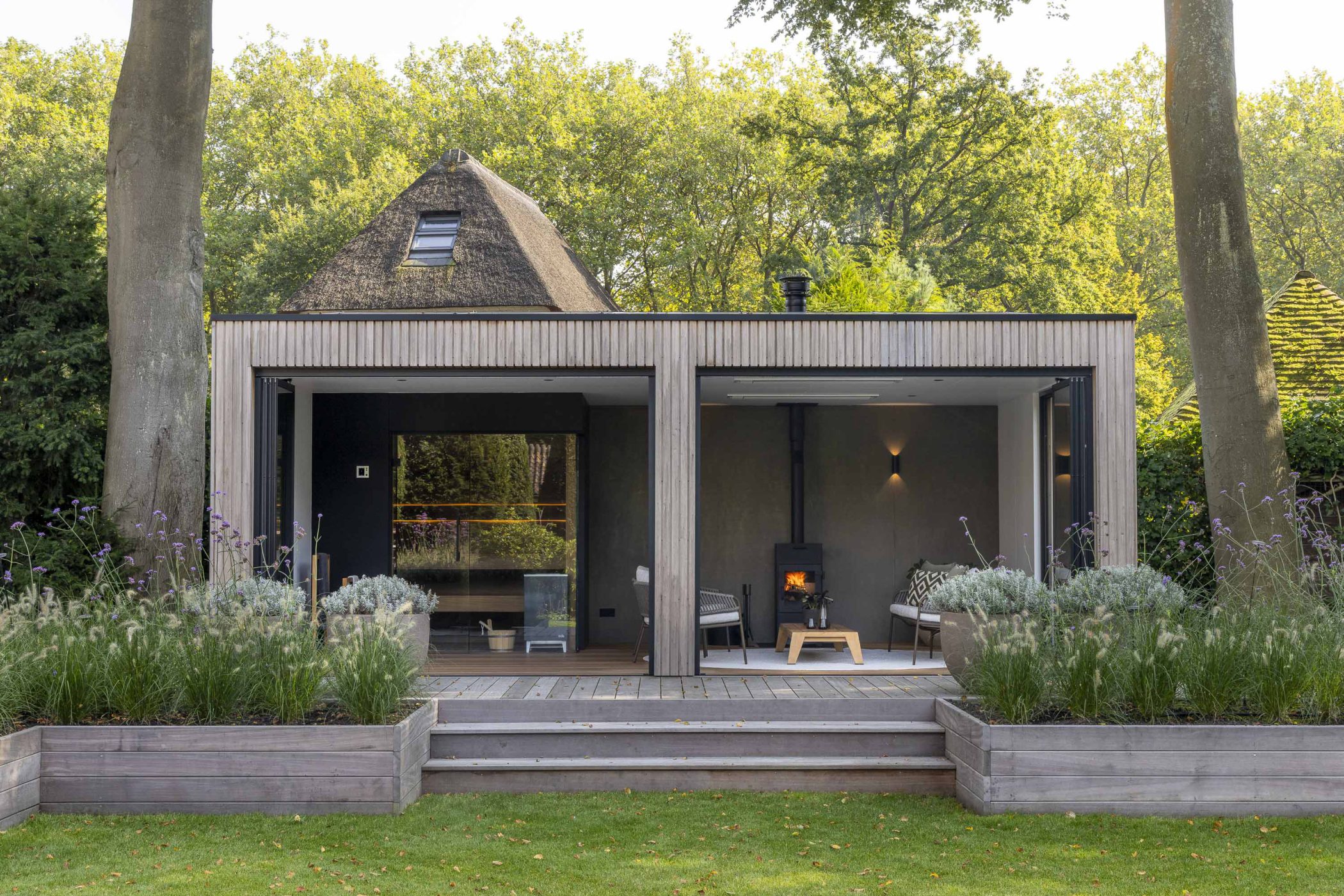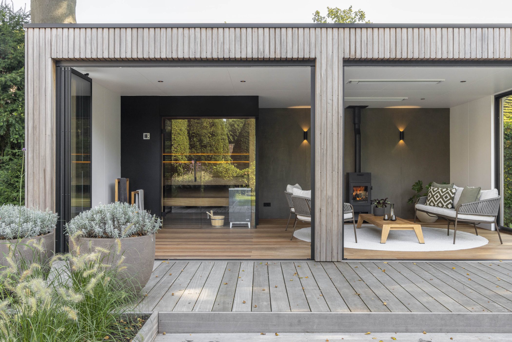 In deze riante villatuin staat een buitenverblijf dat rust ademt. De tuinkamer is ontworpen als een volwaardig buitenhuis: stijlvol, functioneel en verrassend veelzijdig. Het natuurlijke karakter van thermisch gemodificeerd Ayoushout vormt een warme basis. Binnen nodigt een houtkachel uit tot lange avonden, terwijl de geïntegreerde sauna zorgt voor een gevoel van pure wellness, midden in de eigen tuin.