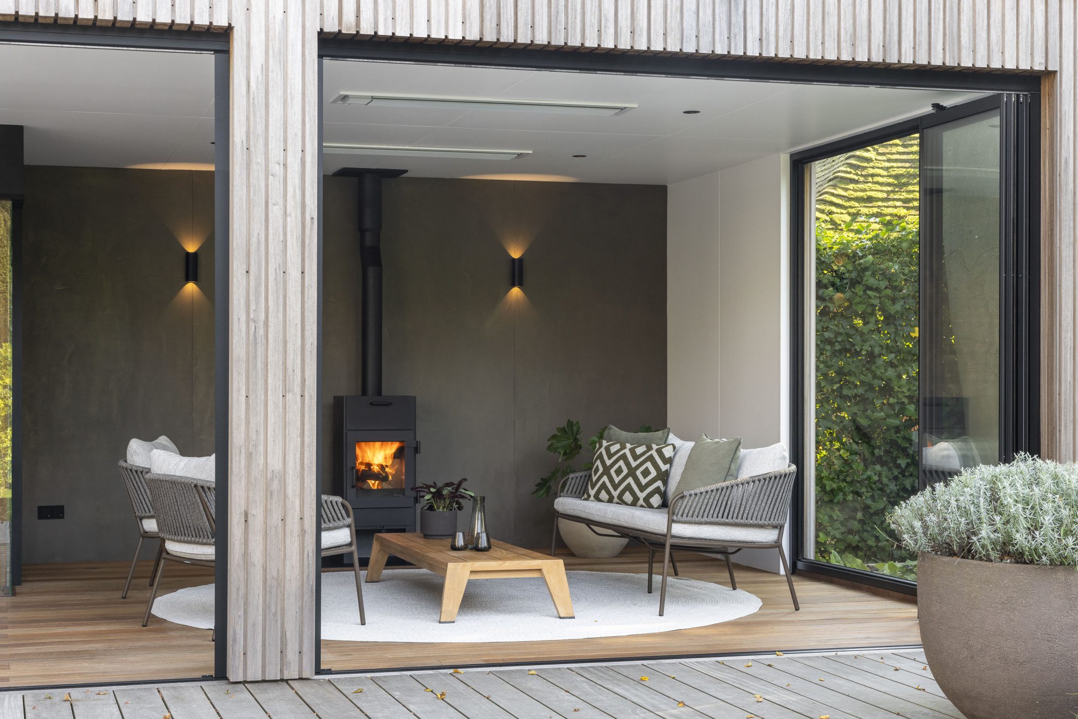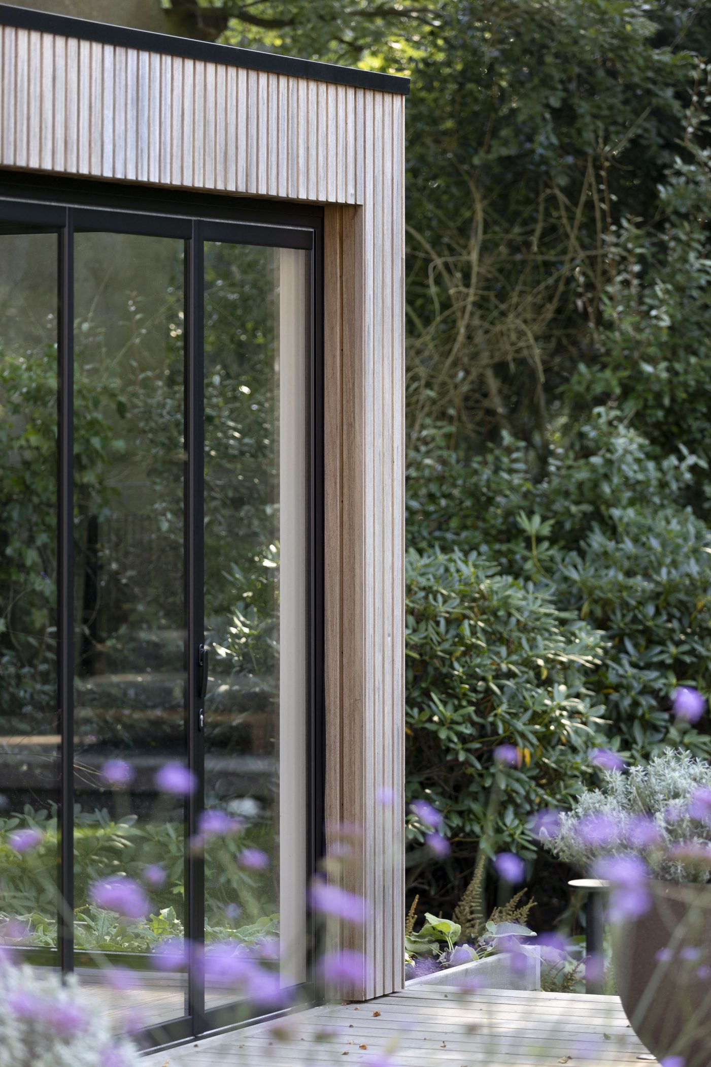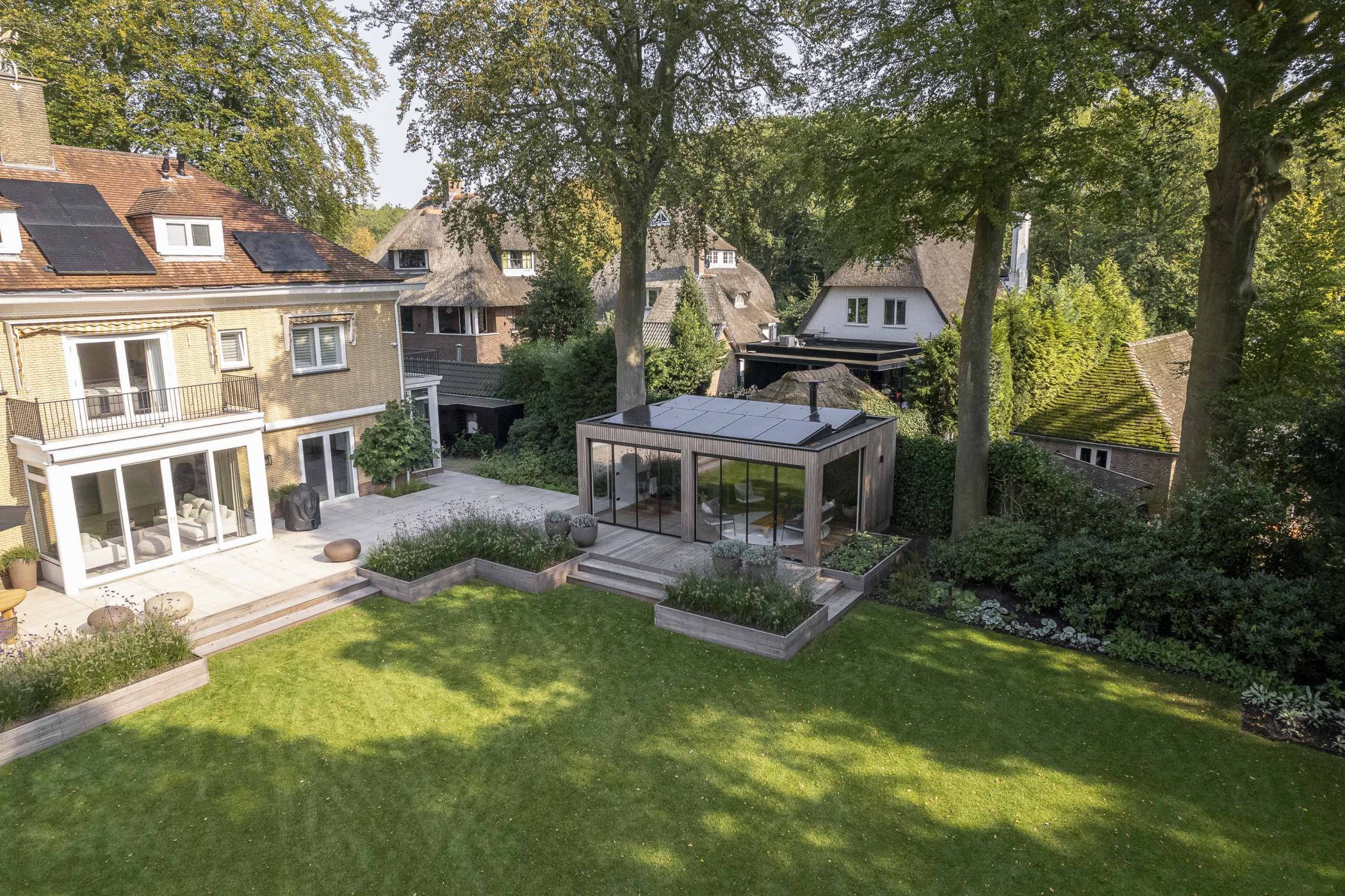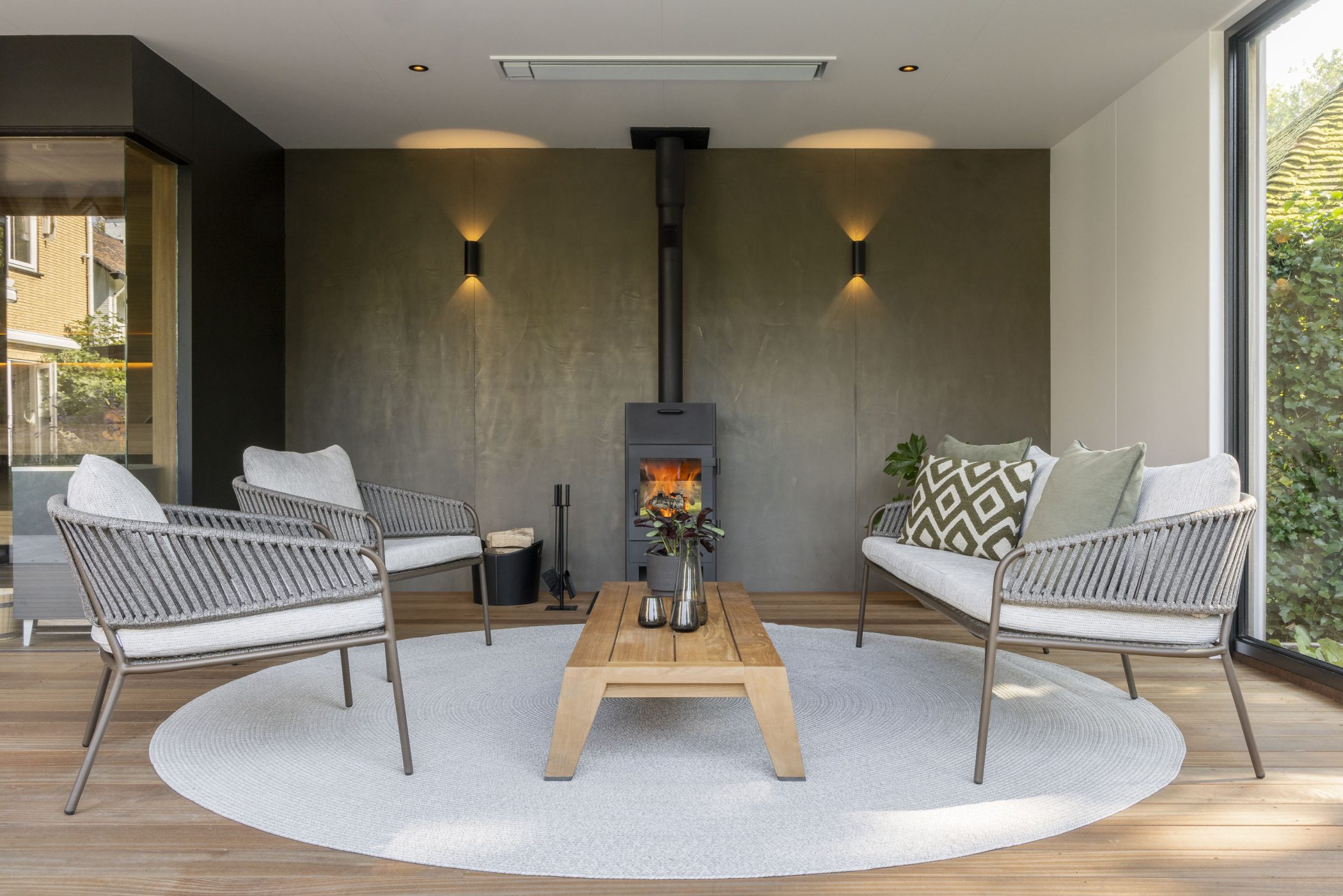 In deze riante villatuin staat een buitenverblijf dat rust ademt. De tuinkamer is ontworpen als een volwaardig buitenhuis: stijlvol, functioneel en verrassend veelzijdig. Het natuurlijke karakter van thermisch gemodificeerd Ayoushout vormt een warme basis. Binnen nodigt een houtkachel uit tot lange avonden, terwijl de geïntegreerde sauna zorgt voor een gevoel van pure wellness, midden in de eigen tuin.