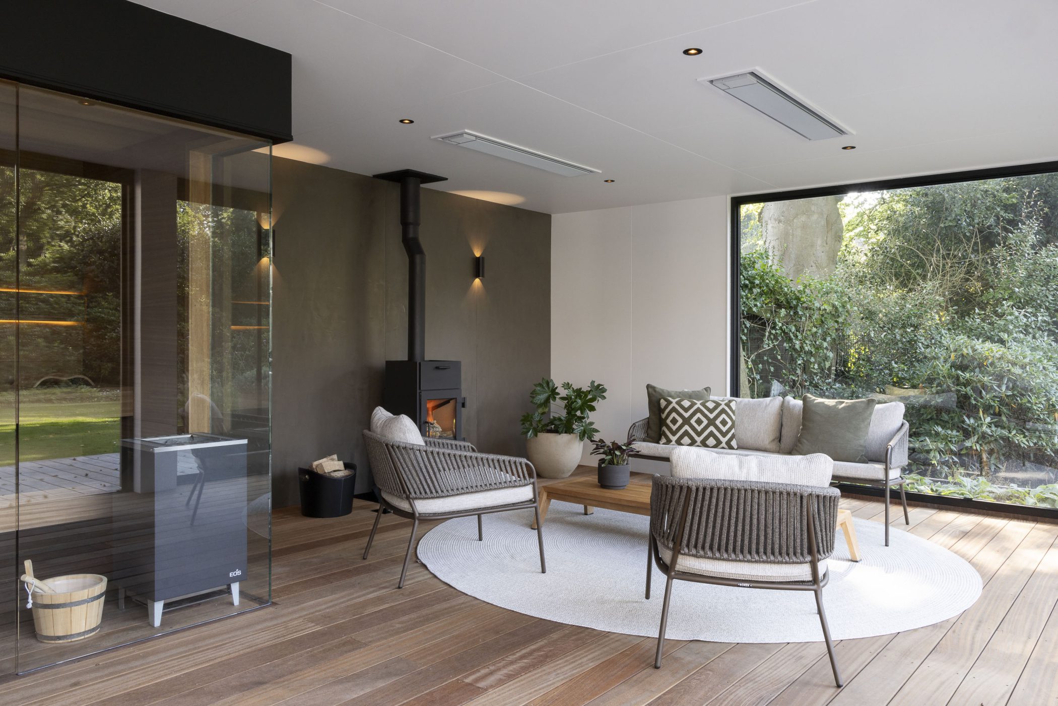 • Bijzonderheden: Geïntegreerde sauna, houtkachel, glazen vouwwanden