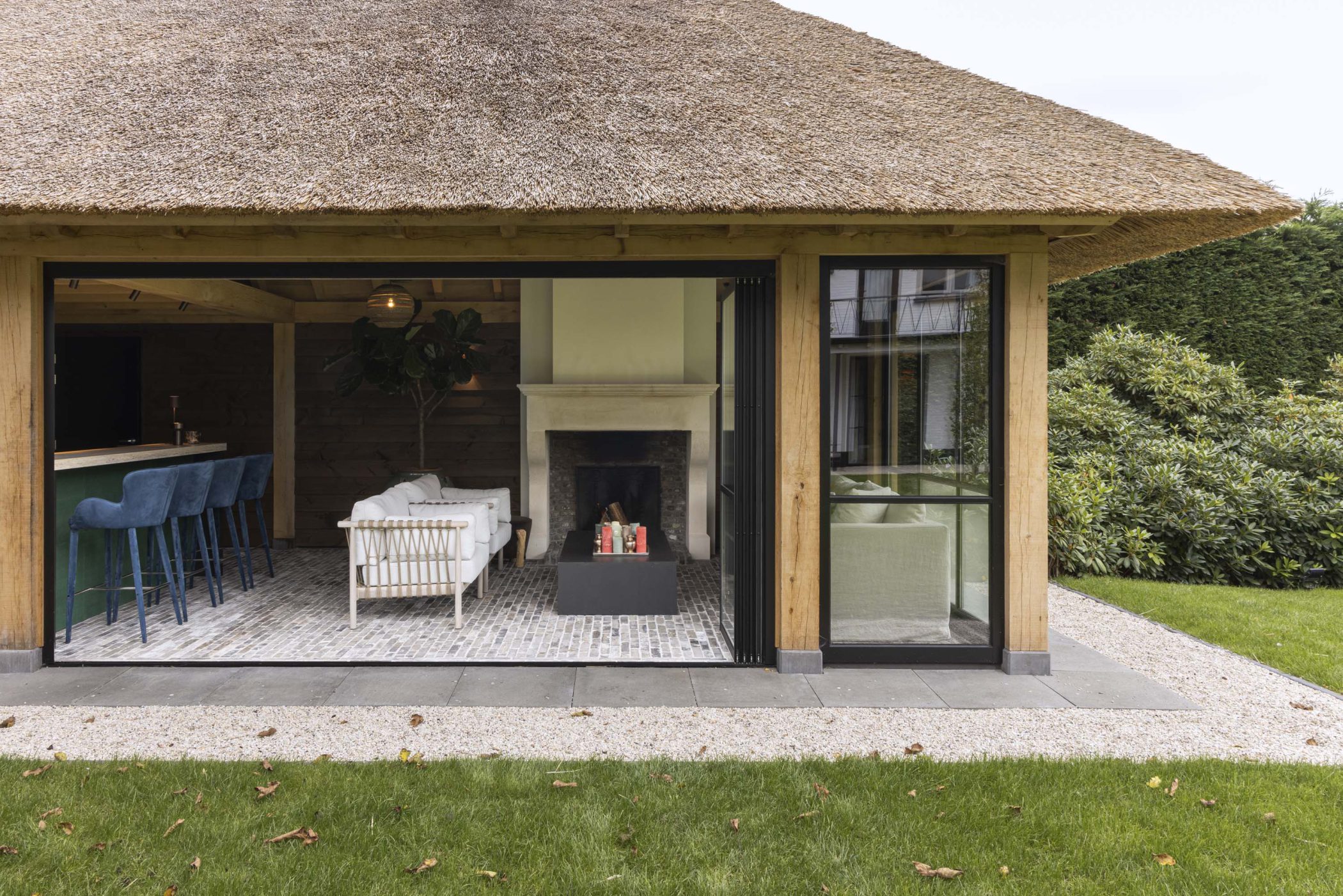 Dankzij de openslaande glaswand haalt u het buiten naar binnen – en andersom. Op mooie dagen zet u alles open en geniet u volop van licht, lucht en leven om u heen. Op koudere dagen blijft het warm en sfeervol binnen, met de haard als stralend middelpunt.