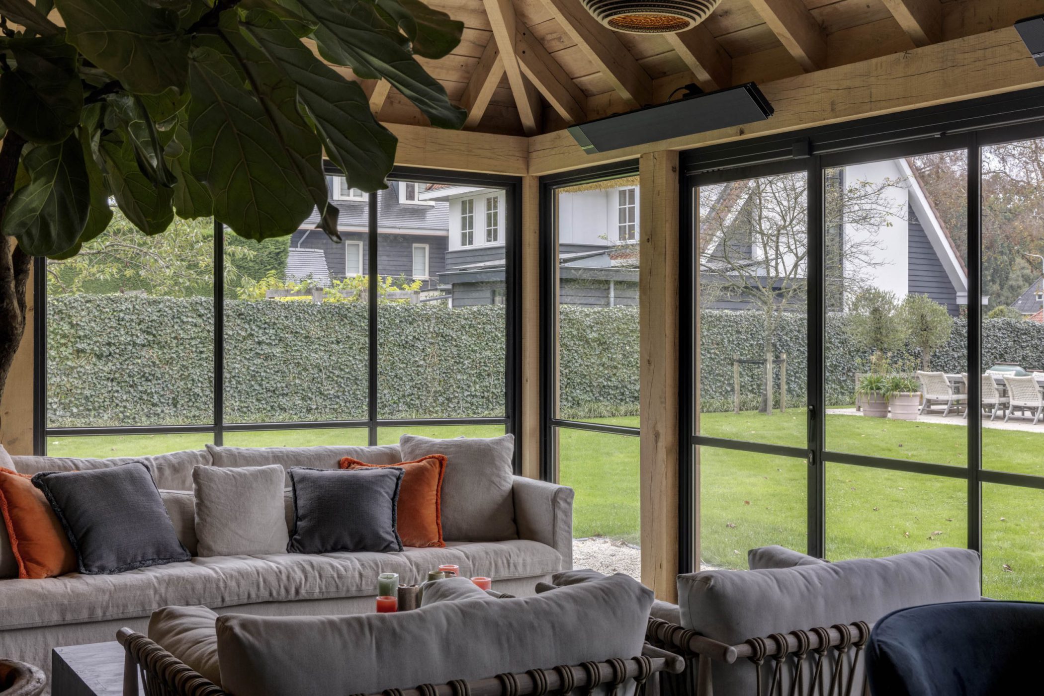 De tuinkamer is met oog voor detail ontworpen. De natuurlijke charme van eikenhout, de ambachtelijke afwerking en de gezellige open haard maken dit tot een plek waar u zich direct op uw gemak voelt. Of u nu de glazen wand openzet en de zon naar binnen laat, of juist de haard aansteekt en het zich binnen behaaglijk maakt, hier zit u altijd goed.