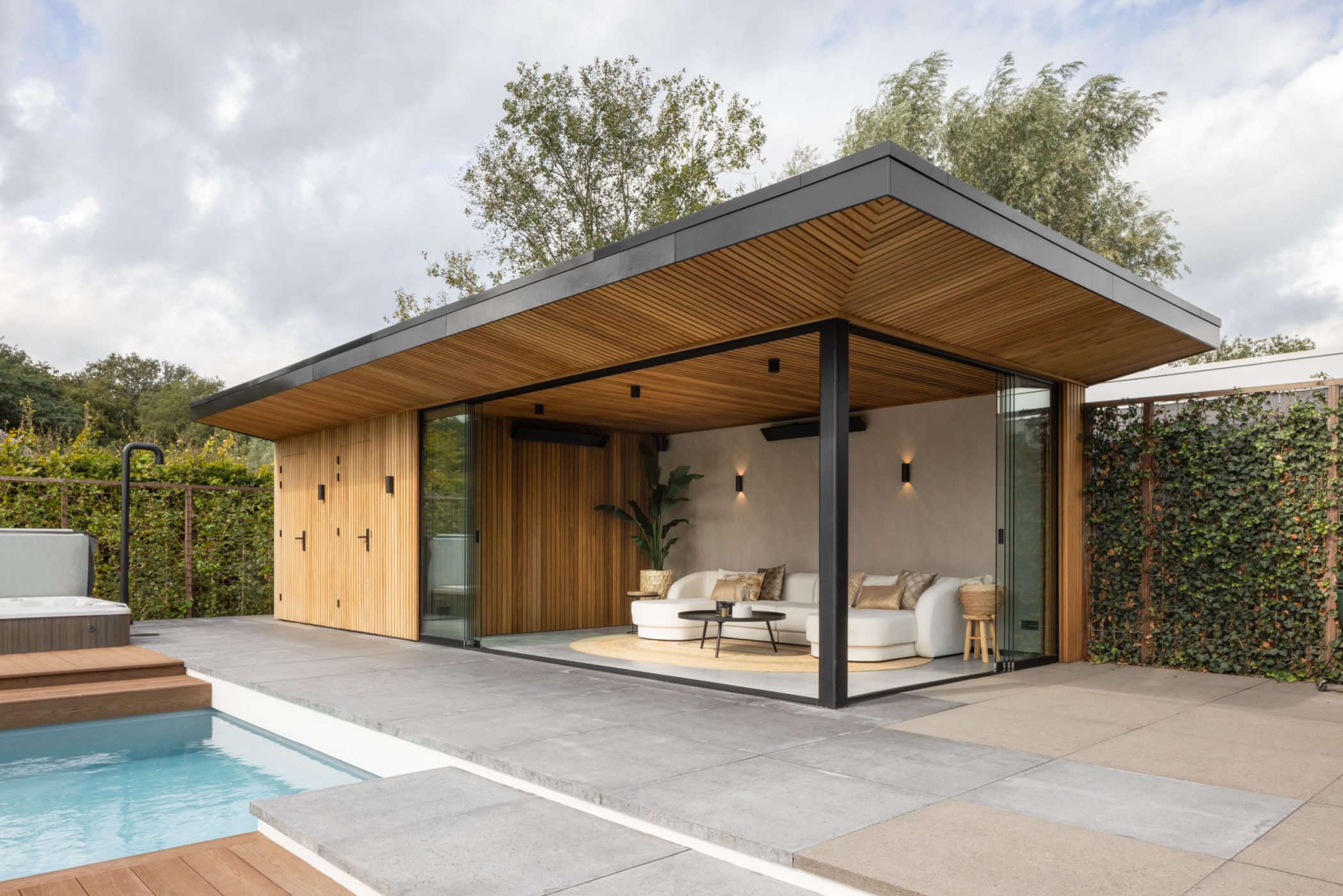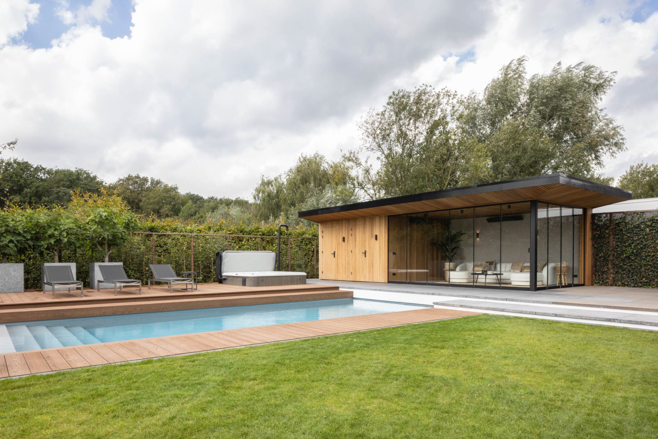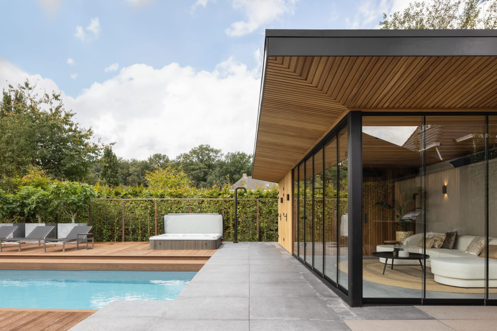 Het houten poolhouse is uitgevoerd in Ayous, met een natuurlijke, warme uitstraling die prachtig aansluit op de tuin en het omliggende landschap. De strakke lijnen en verfijnde details maken van dit ontwerp een uitnodigende maar ingetogen blikvanger.