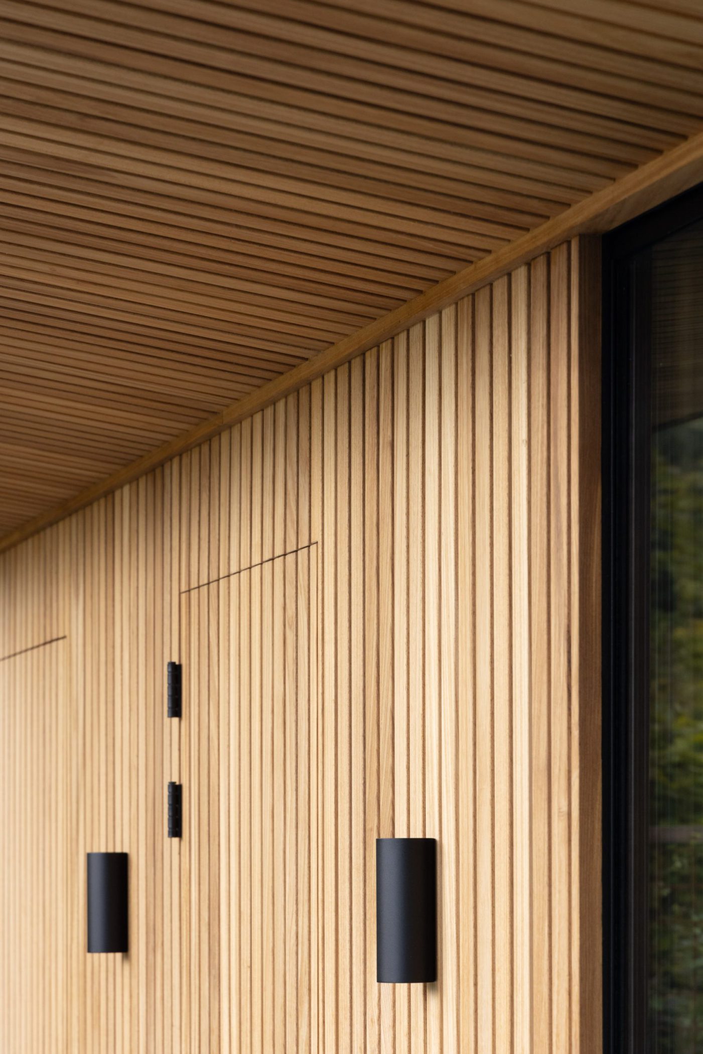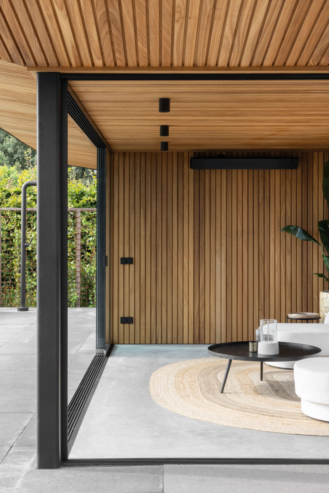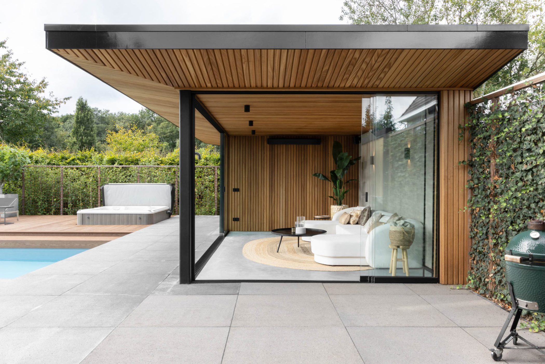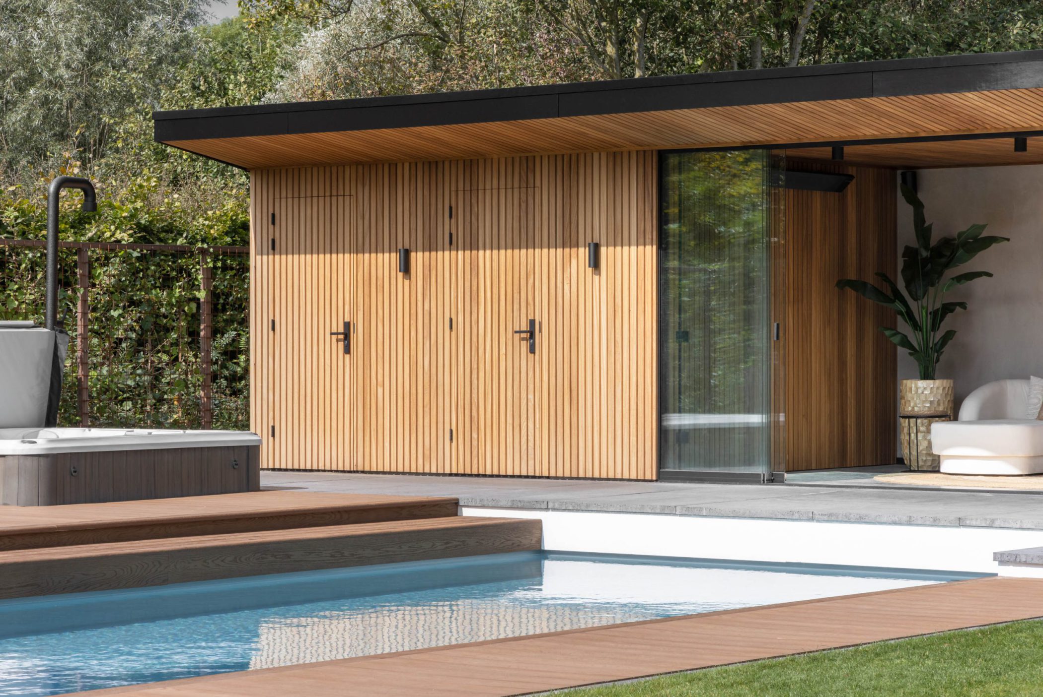 Het houten poolhouse is uitgevoerd in Ayous, met een natuurlijke, warme uitstraling die prachtig aansluit op de tuin en het omliggende landschap. De strakke lijnen en verfijnde details maken van dit ontwerp een uitnodigende maar ingetogen blikvanger.