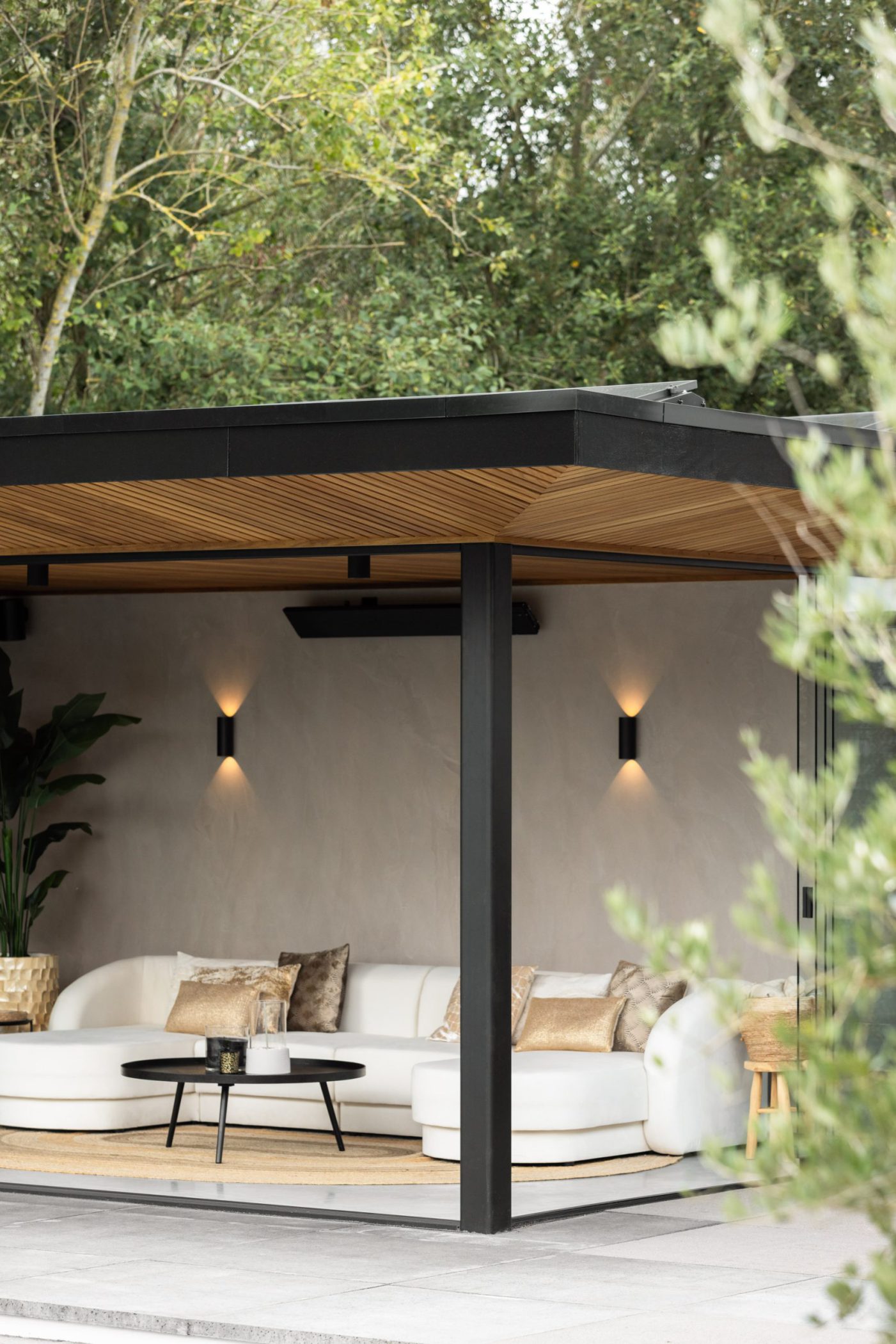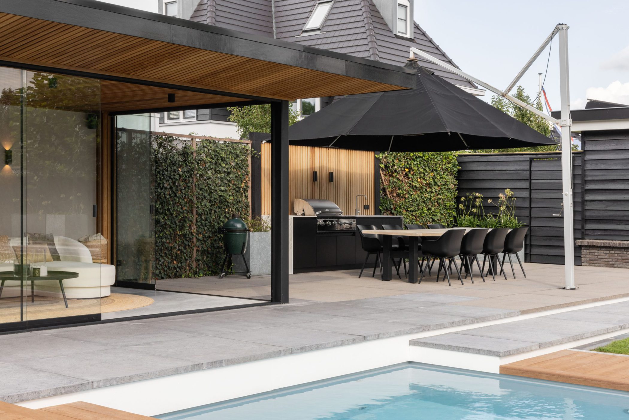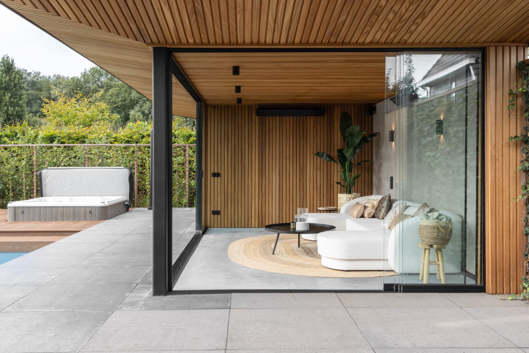 In deze tuin komt alles samen: modern vakmanschap, natuurlijke schoonheid en ultiem comfort. Dit poolhouse, ontworpen en gerealiseerd door Bronkhorst, vormt een mooie combinatie met het stijlvolle zwembad. Een plek waar buitenleven en ontspanning op het hoogste niveau samenkomen.