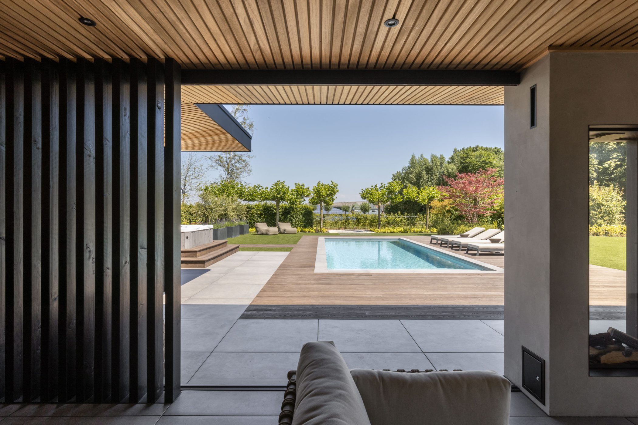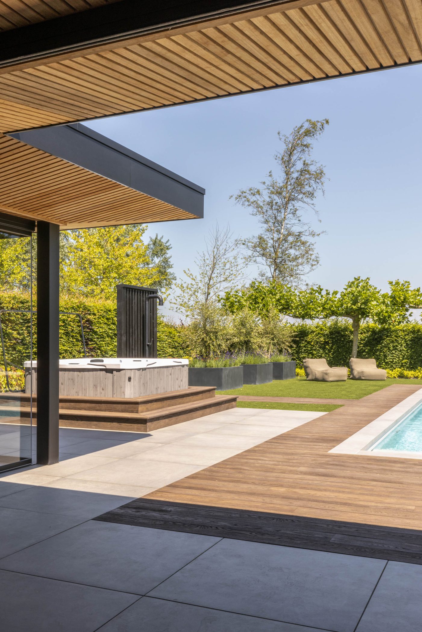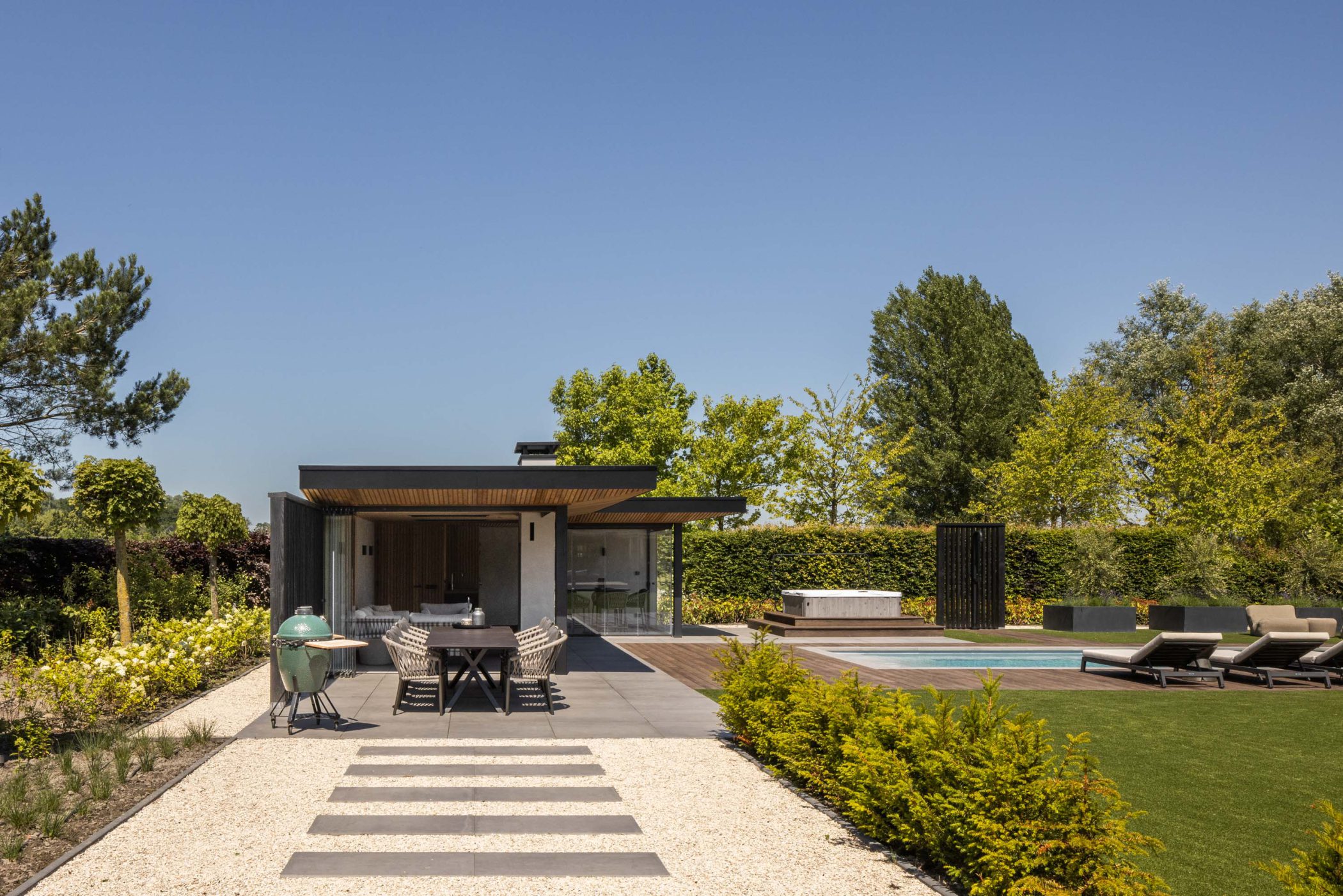 In het poolhouse wacht een extra element van luxe: een eigen spa. Hier ontspant u volledig, met zicht op het water en de omringende tuin. Wat begon als een ontwerp op papier, is werkelijkheid geworden: een oase van rust, gebouwd met oog voor detail en gebruik.