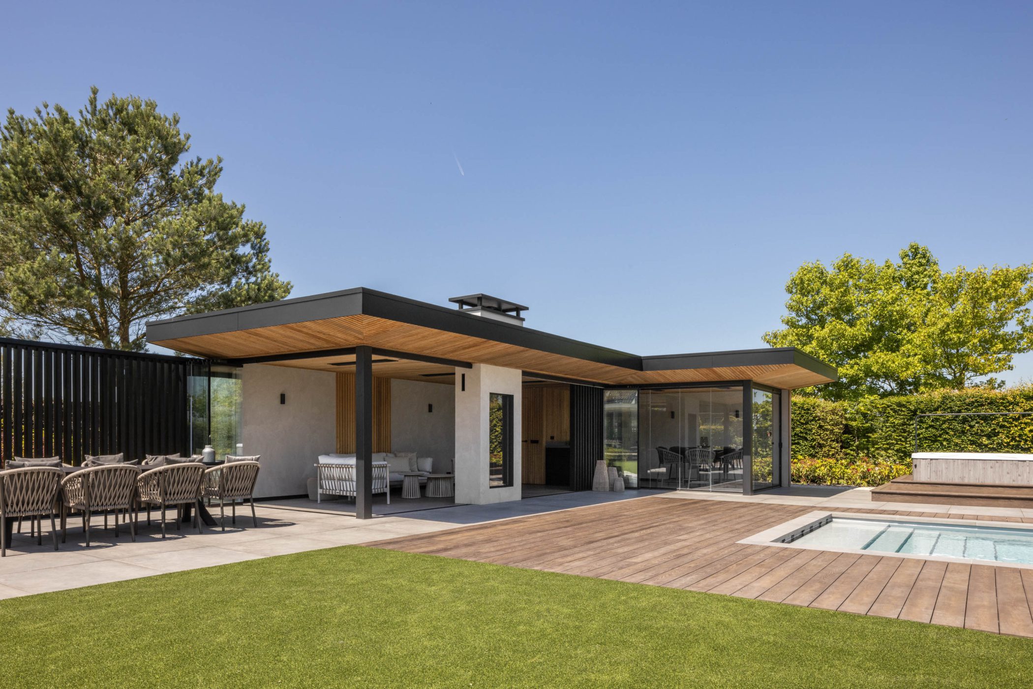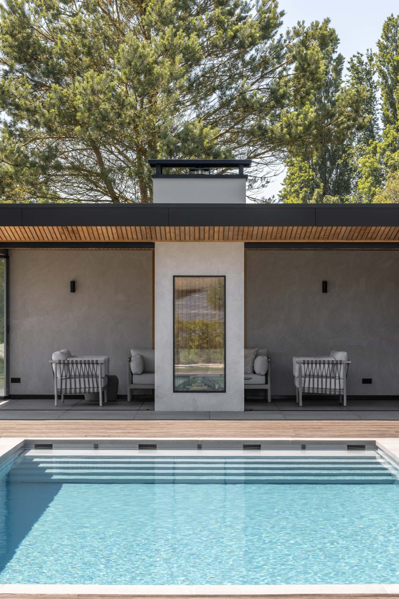 Het ontwerp is gericht op comfort, zonder in te leveren op elegantie. Glazen draai-schuifwanden aan de voorzijde maken het mogelijk om het poolhouse volledig te openen. Hierdoor vervaagt de grens tussen binnen en buiten en ontstaat een leefruimte die meebeweegt met het weer.