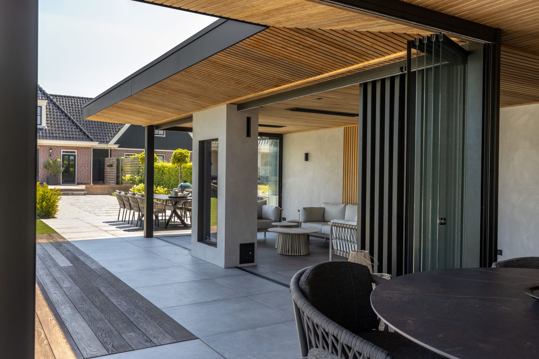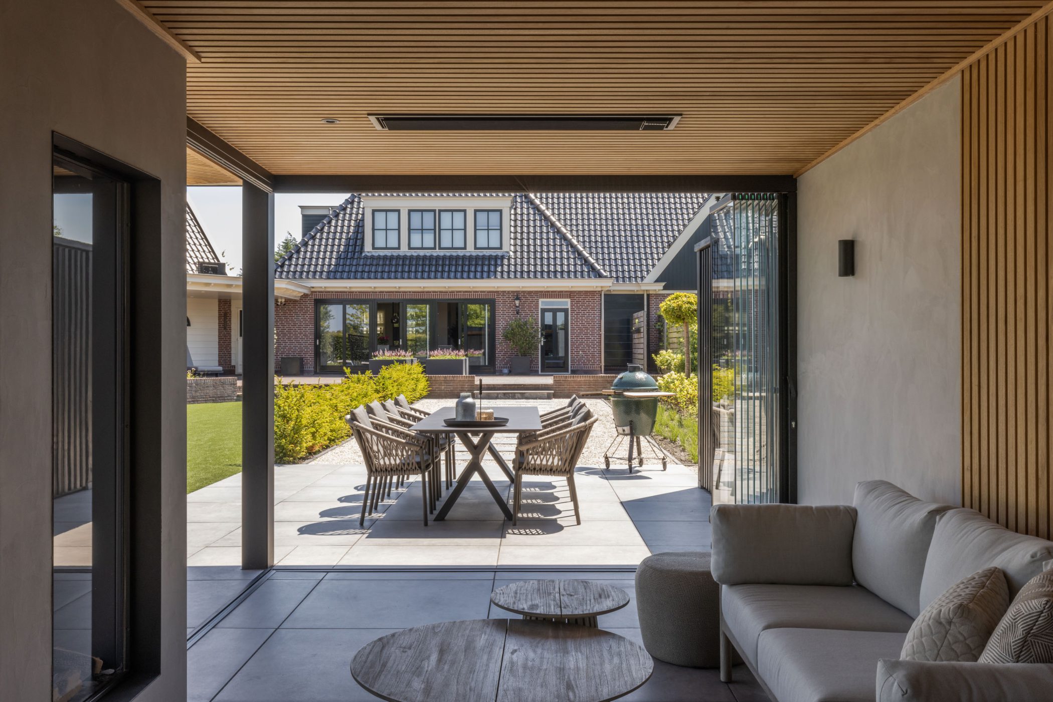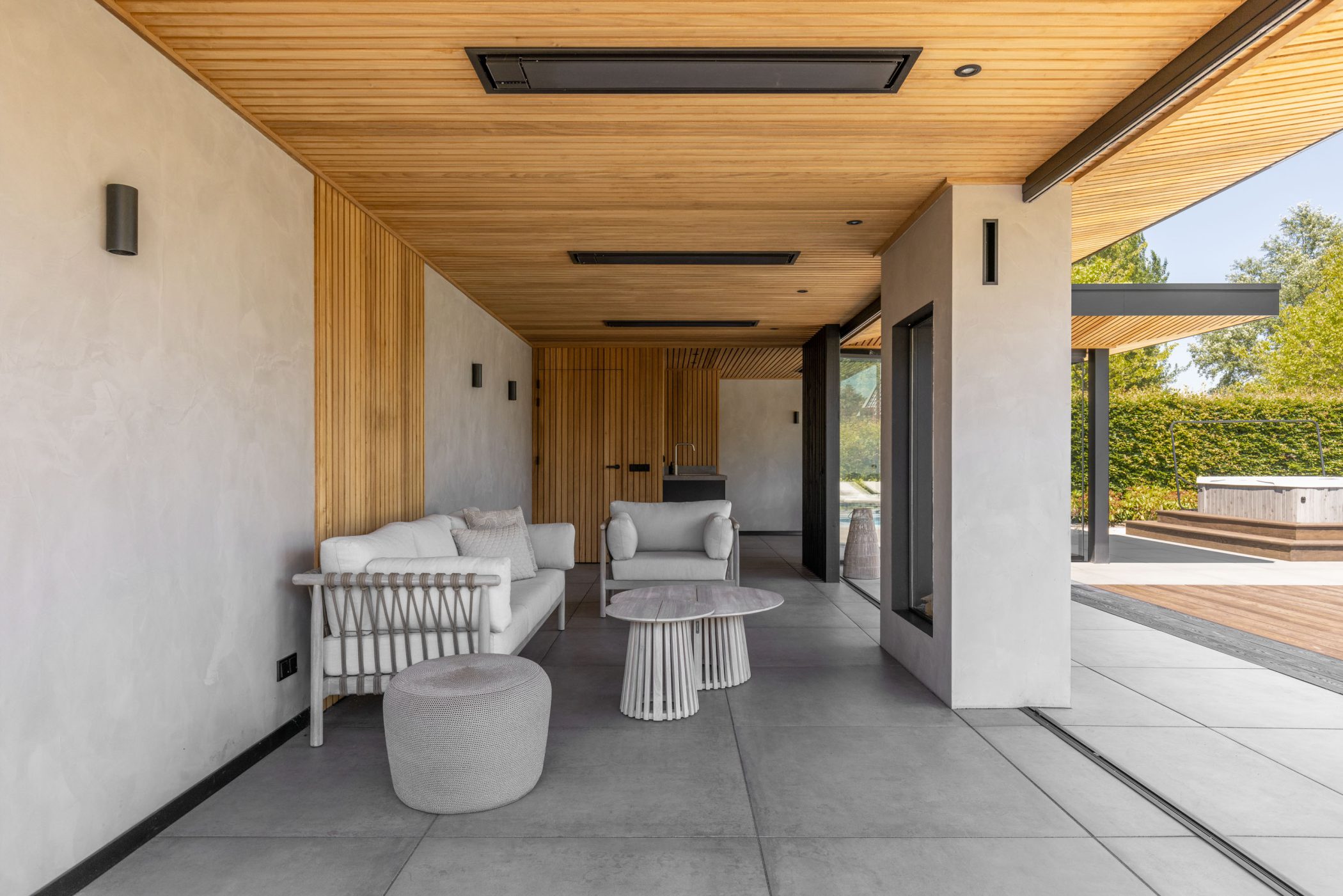 • Bijzonderheden: L-vorm, glazen schuif-draaiwand, COOXS buitenkeuken, haard, heaters, spa, toilet en technische ruimte
