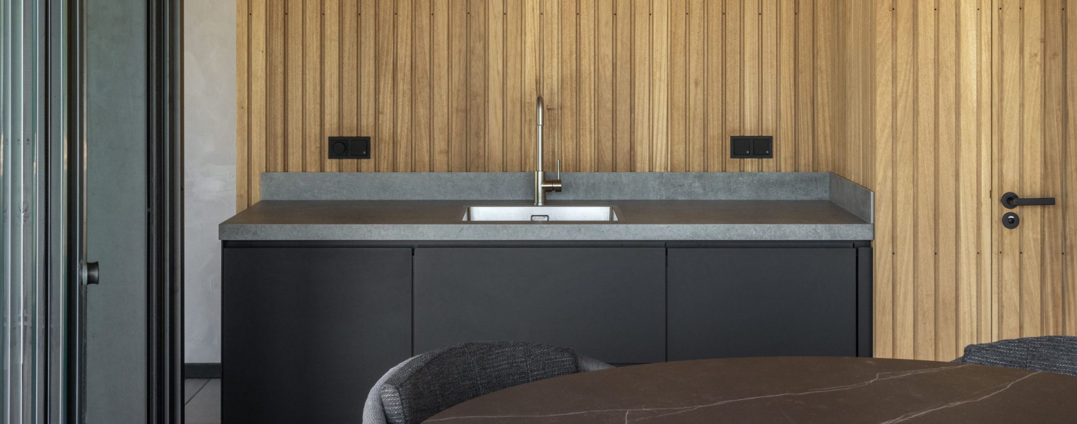 Het poolhouse vormt een royale L-vorm rond het Starline zwembad en creëert zo meerdere sferen binnen één geheel. De twee afzonderlijke zitruimtes zijn verbonden door een op maat ontworpen COOXS buitenkeuken: het kloppend hart van dit verblijf. Overdag is het de plek om samen te komen, ‘s avonds transformeert het tot een stijlvolle lounge met uitzicht op het water.