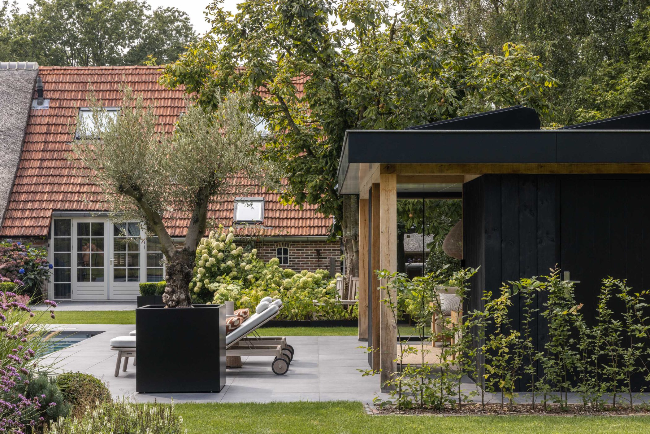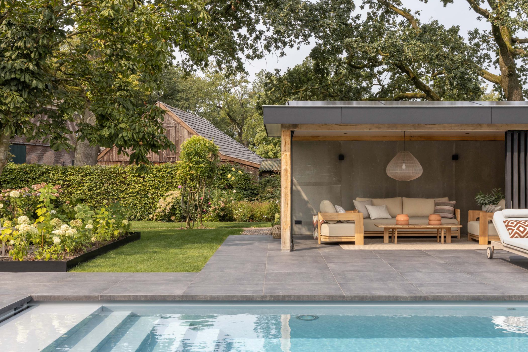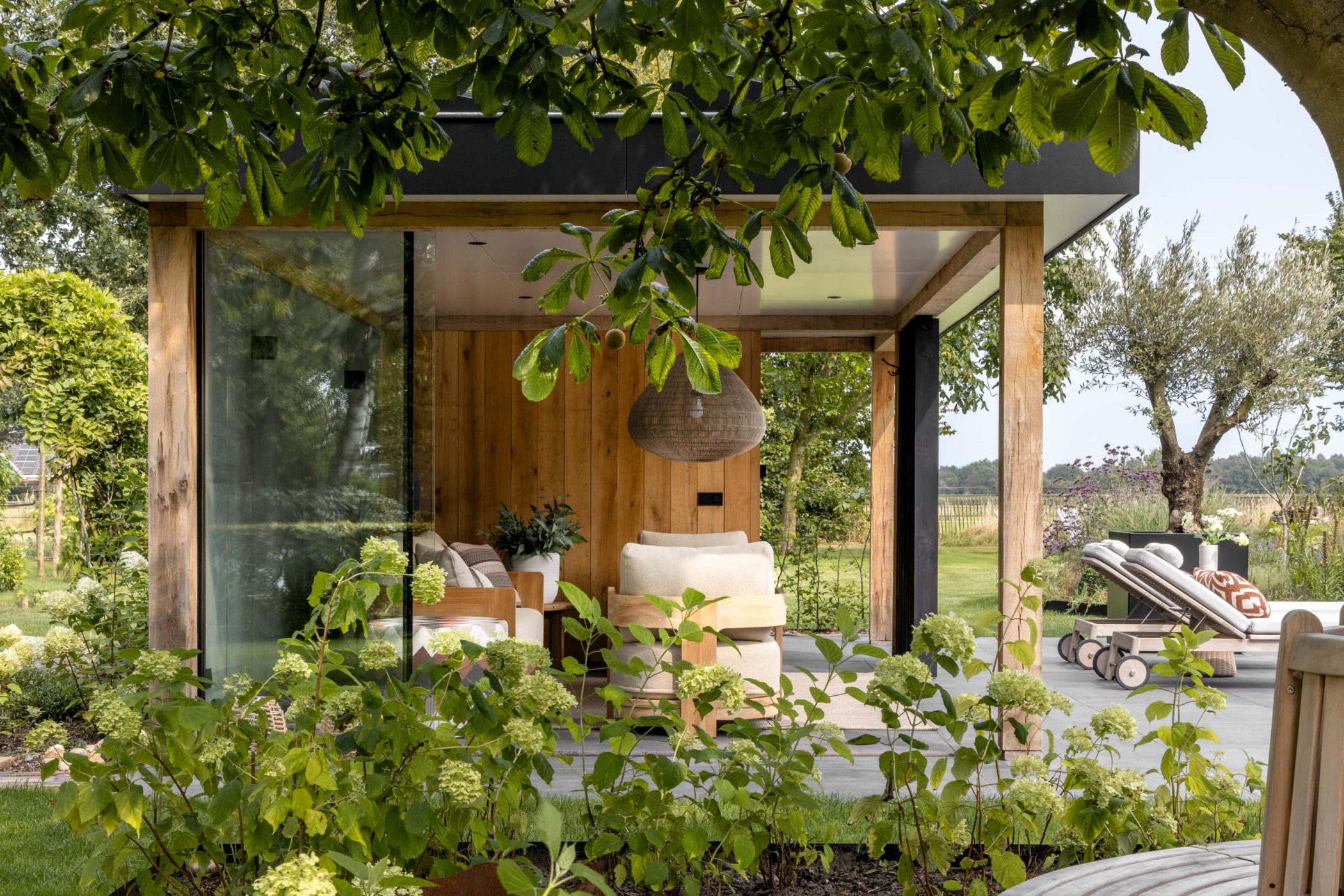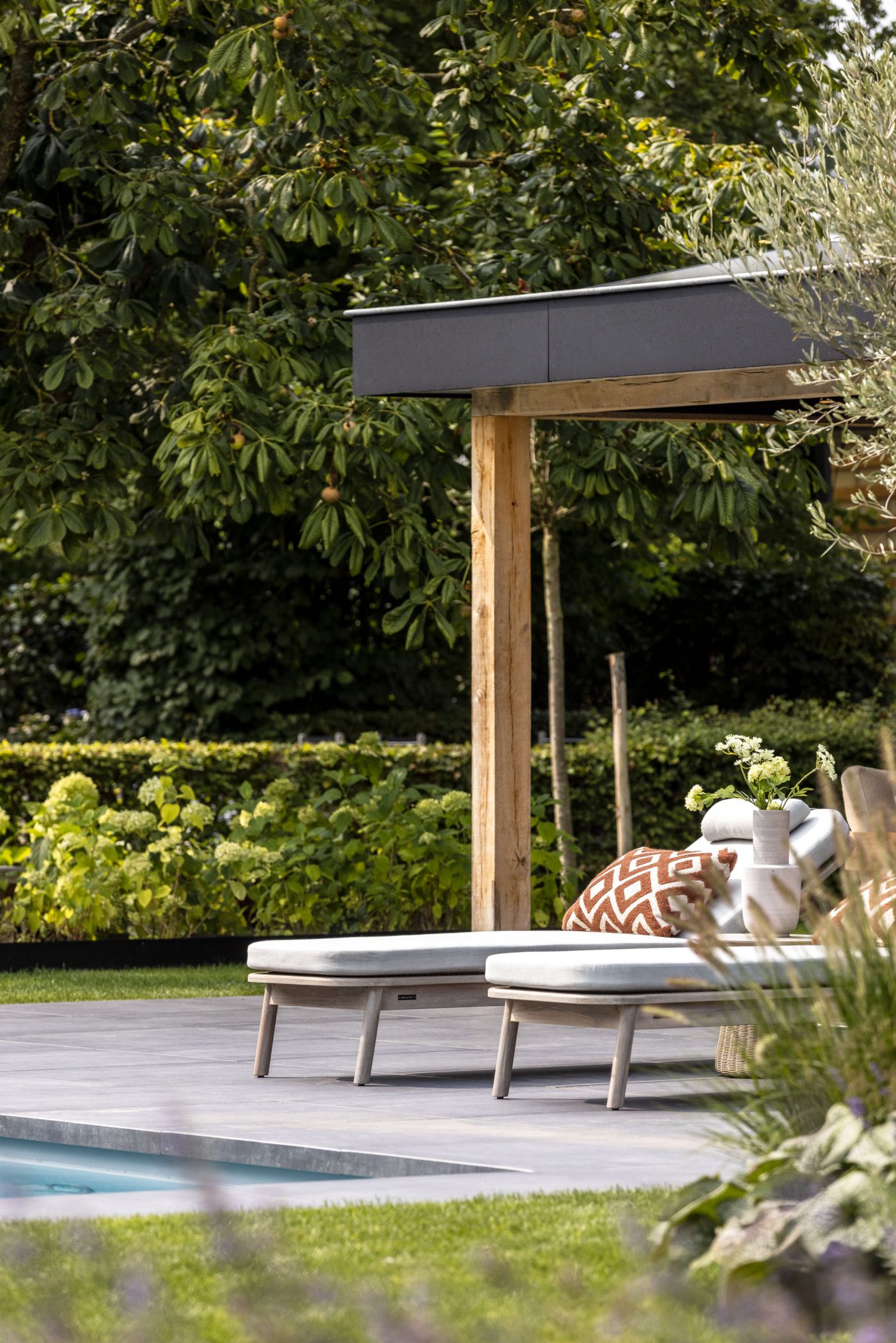 Of u nu een duik neemt op een warme zomerdag of liever schut zit met uitzicht op het kalme water: deze landelijke tuinkamer nodigt uit. De warme uitstraling van eikenhout contrasteert prachtig met de strakke lijnen van het zwembad en het moderne tuinontwerp. Over elk detail is nagedacht. De ligbedden op het terras vormen een natuurlijk verlengstuk van de ruimte binnen. Dankzij het royale oppervlak van 7 bij 5 meter is er voldoende ruimte om te loungen, te lezen of simpelweg te genieten van het uitzicht.