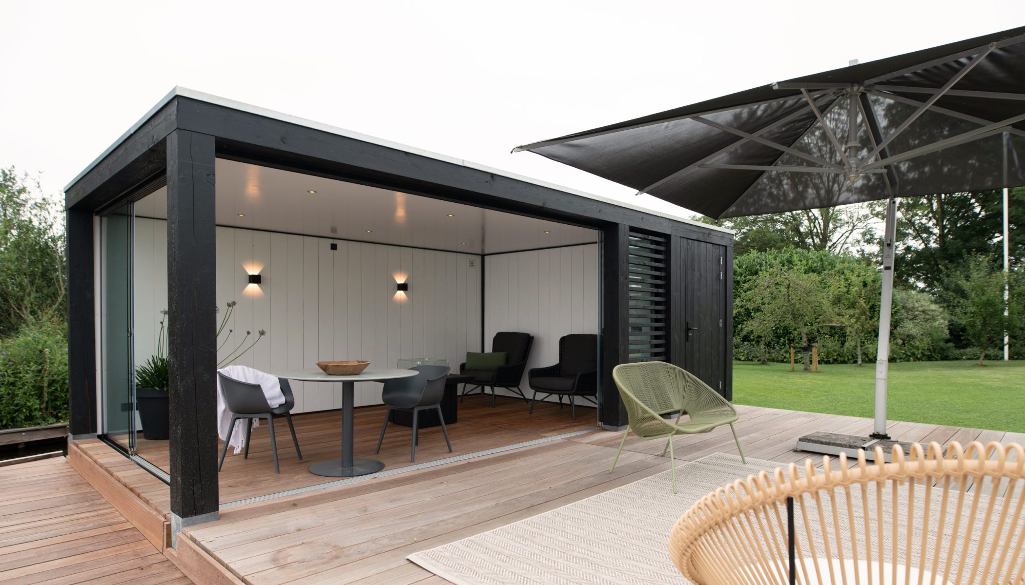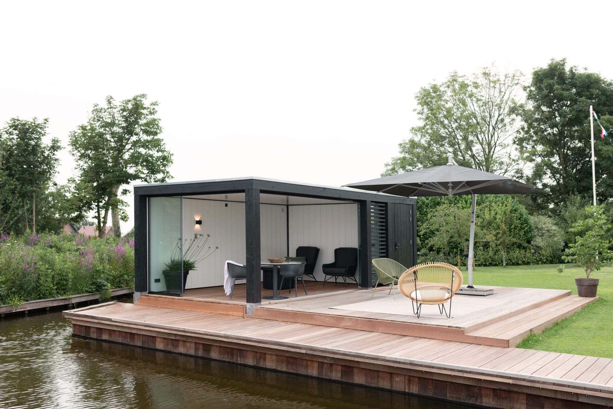 Een prachtige zwarte tuinkamer van douglas hout aan het water. Functioneel door haar opbergruimte, elegant door de ingebouwde spots en de sfeerverlichting aan de witte gebeitste wanden. Naadloos geïntegreerd in de tuin. De vlonder die het water met de tuin en de tuinkamer verbindt. Een plek om even helemaal weg te dromen.