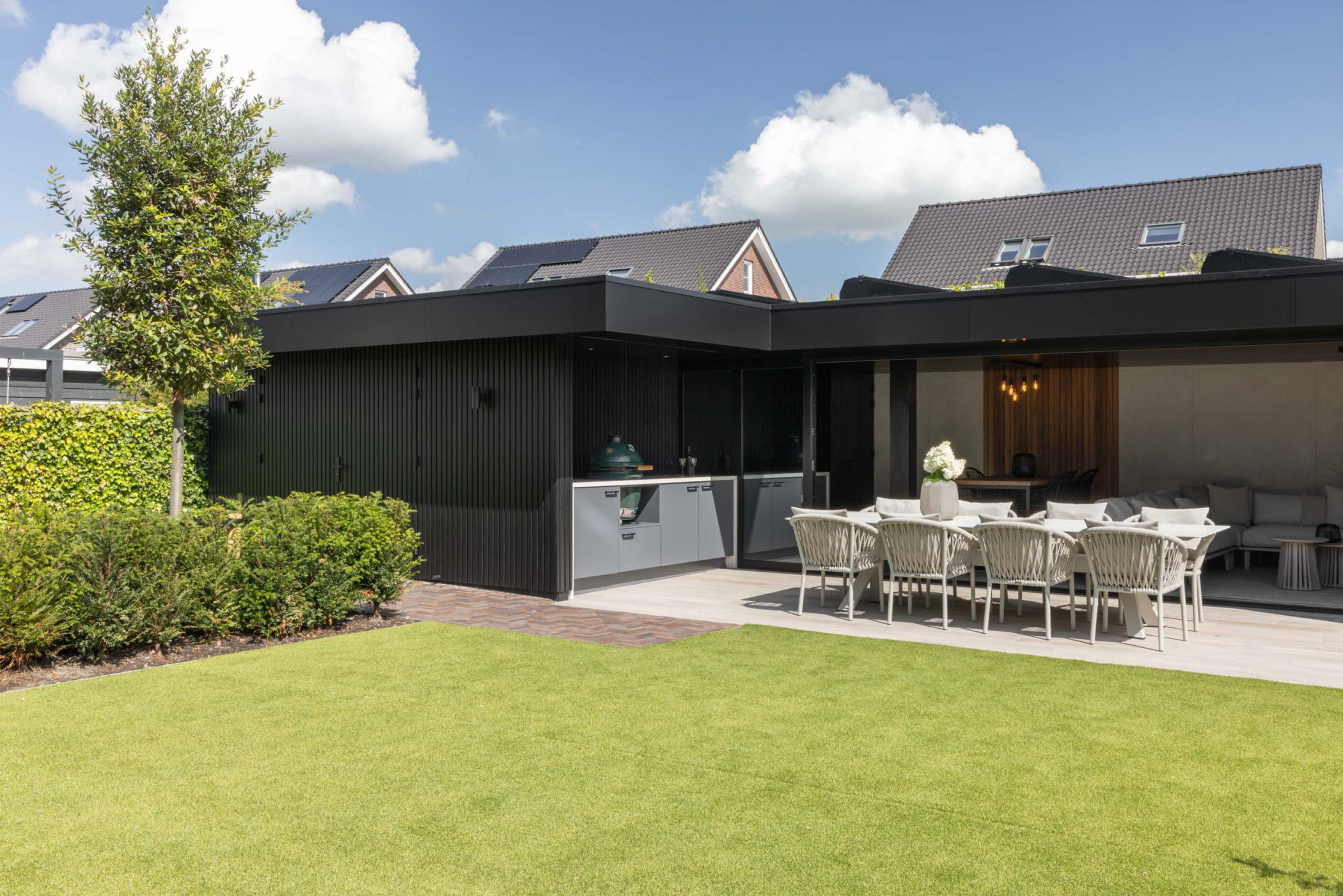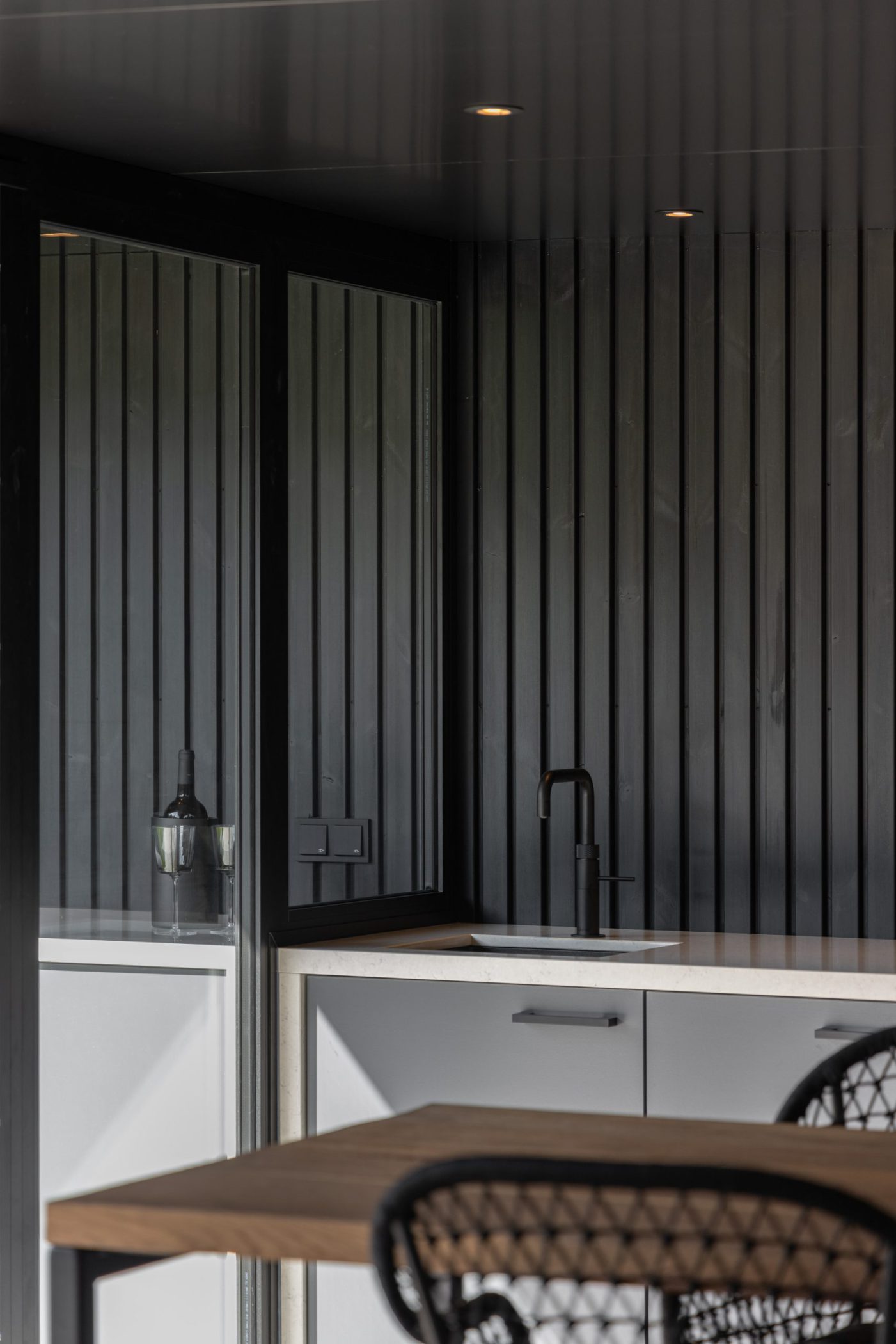 Deze stijlvolle tuinkamer is een waar buitenverblijf waarin koken, ontspannen en samen zijn samenkomen. Voorzien van een ingebouwde keuken met BBQ, opvouwbare glazen wanden en hoogwaardige materialen biedt dit ontwerp het ultieme buitenkookplezier, in elk seizoen.