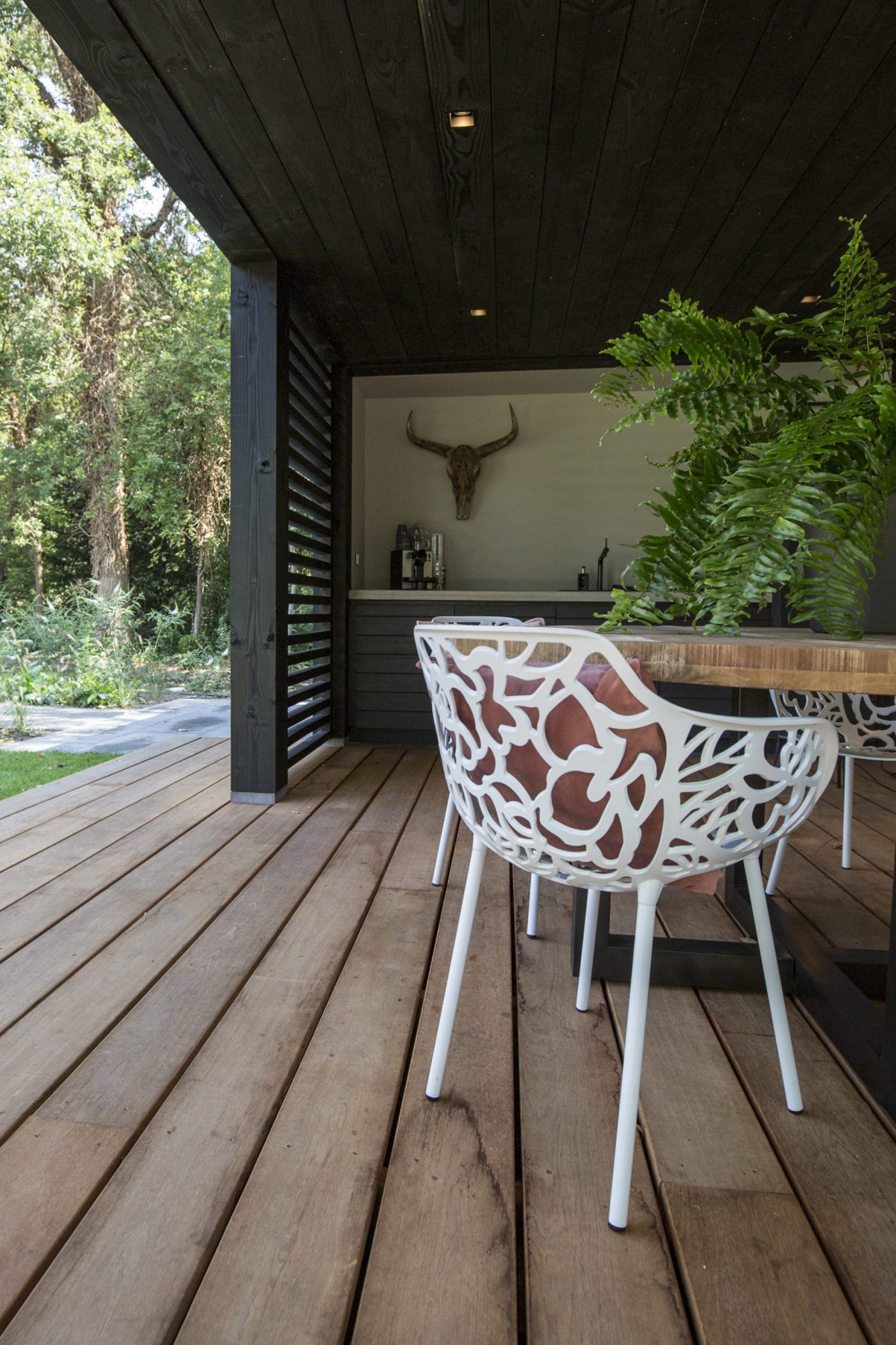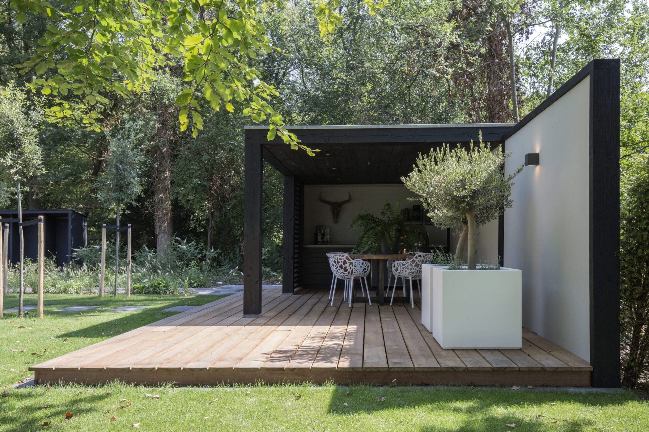 Deze luxe tuinkamer staat in een prachtige groene tuin, die met aandacht is ontworpen. De tuinkamer heeft douglas geschaafde staanders: duurzaam, stevig en mooi tegelijk. Met zwarte lamellen voor extra privacy. Fraai om te zien en gebruik van te maken in alle seizoenen. De houten vlonder springt in het oog doordat hij van binnen naar buiten doorloopt. Een prachtig geheel.