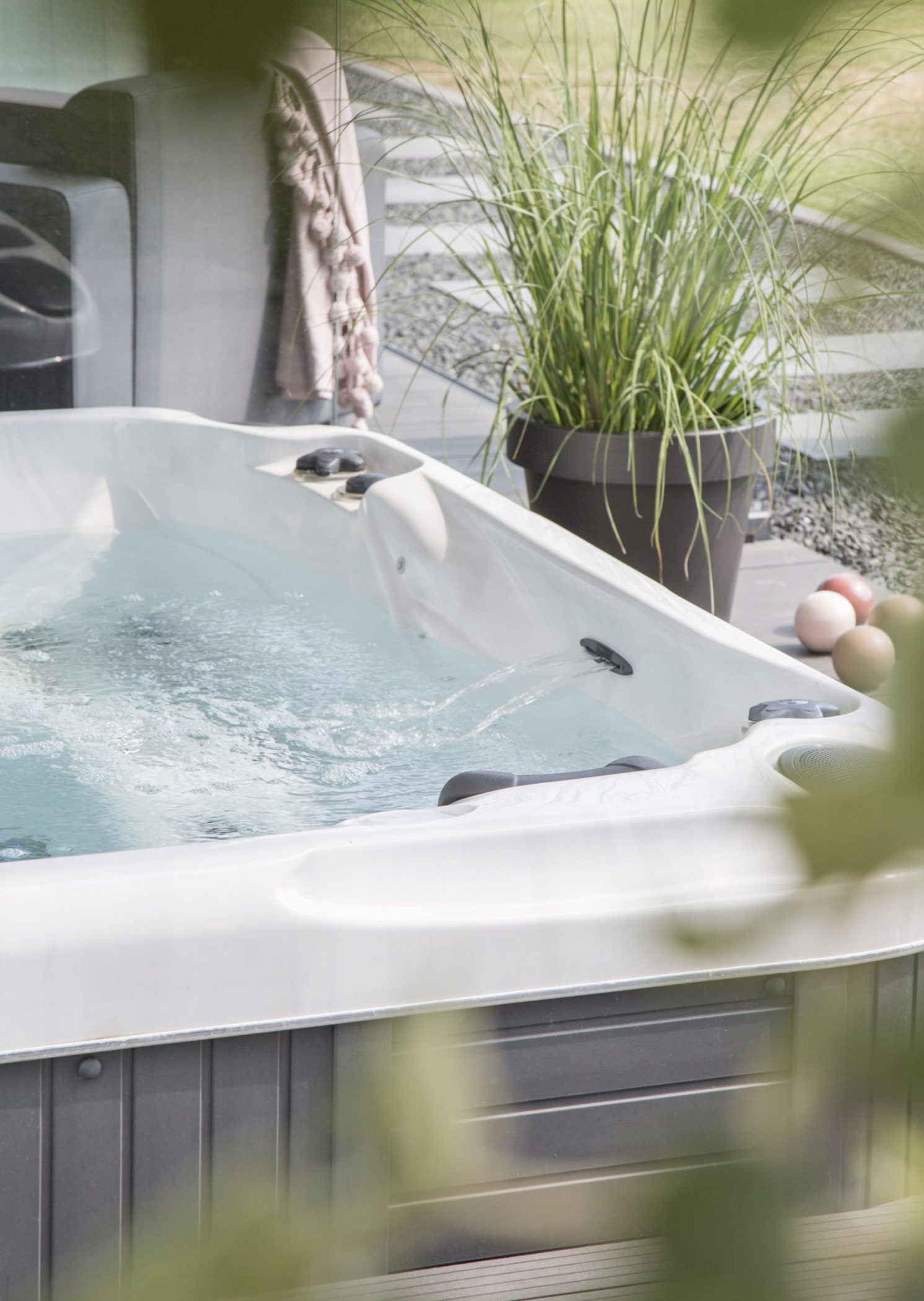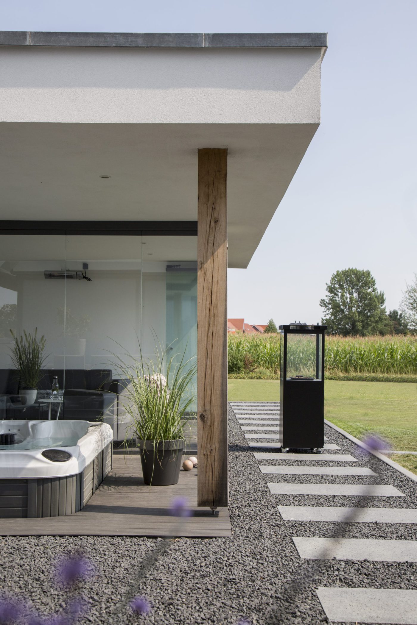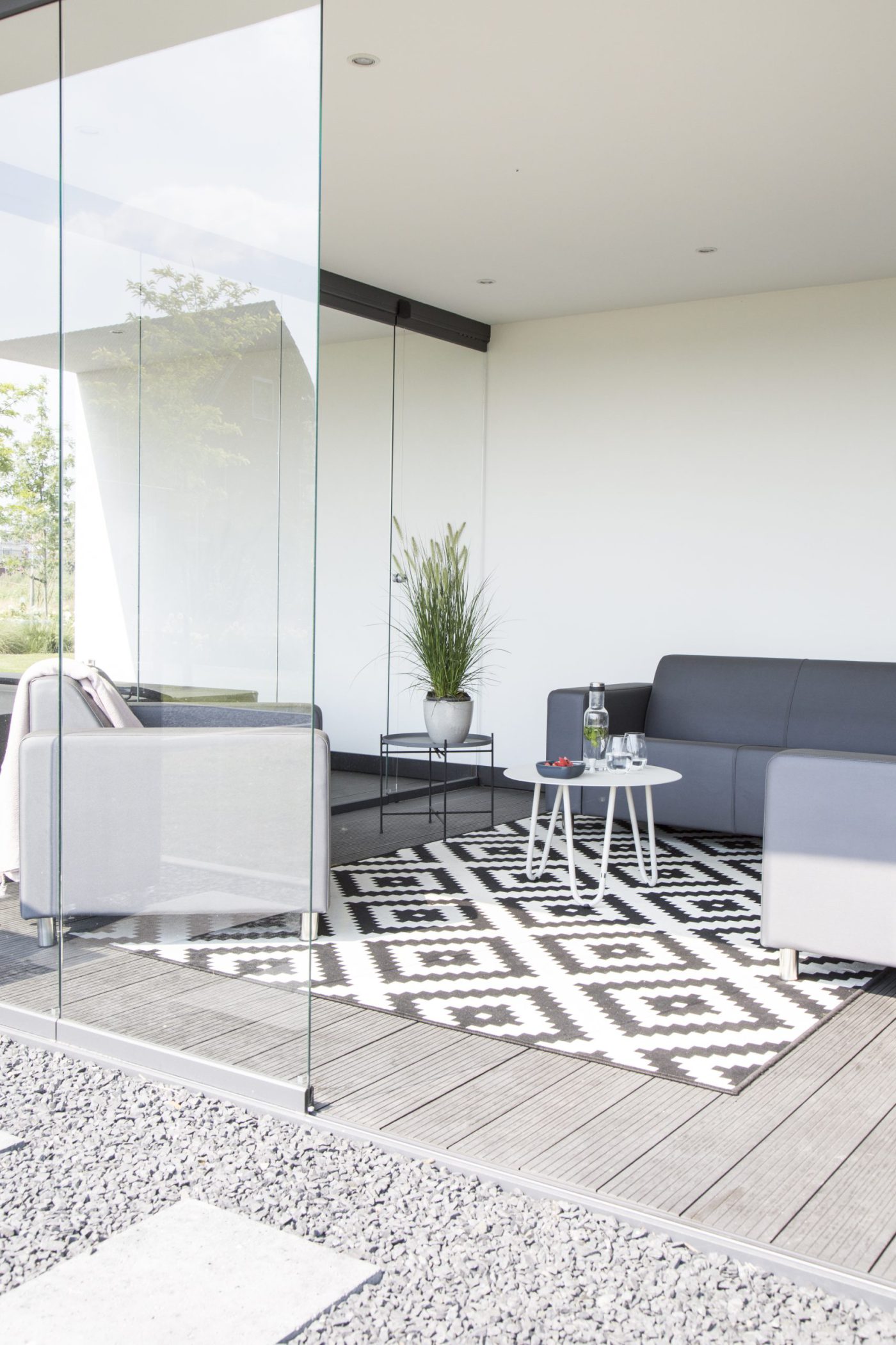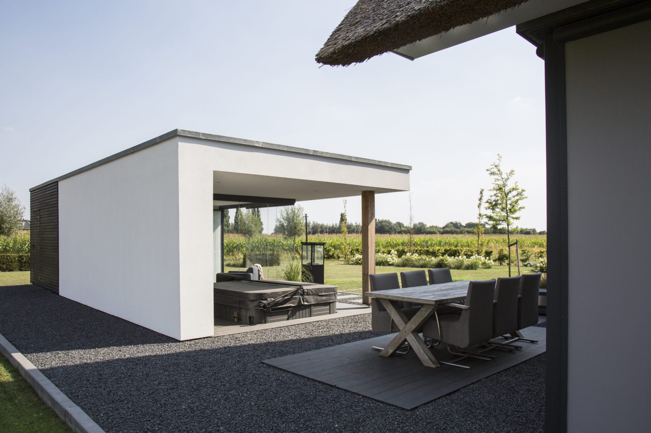 Het moderne design van dit tuinhuis past perfect bij de woning. Het moderne tuinhuis heeft een met glazen wanden afsluitbaar gedeelte en een luxe spa. Het hout in combinatie met de strakke dakrand en wanden, scheppen een rustig beeld. Binnen in dit design tuinhuis valt het stijlvolle witte stucwerk direct op. De lange avonden in de spa zijn prettig onder deze overkapping.